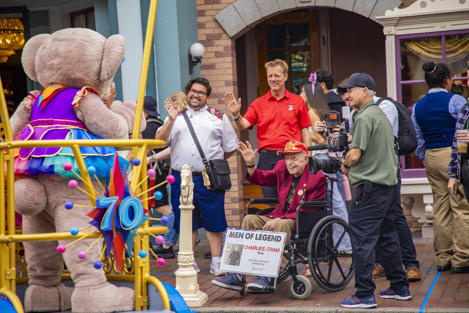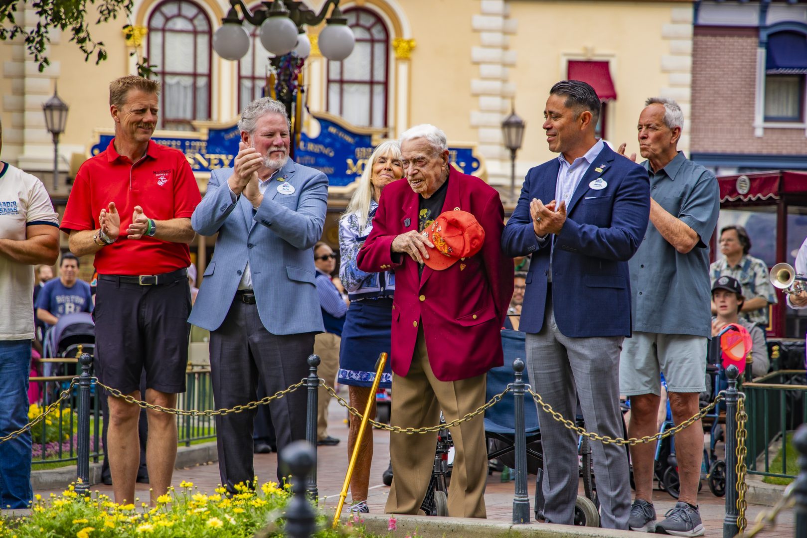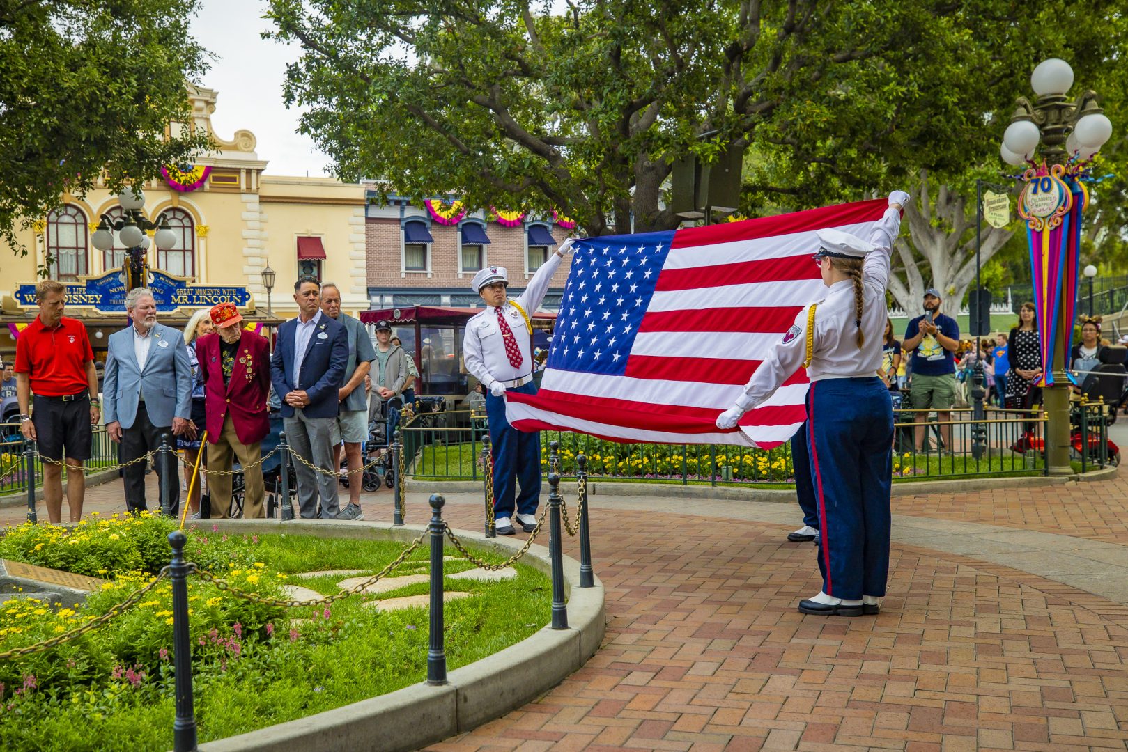 In the glow of the late afternoon sun on Main Street, U.S.A., people assembled around the Town Square flagpole to take part in a special ceremony celebrating Charles. Since Disneyland’s earliest days, the daily Flag Retreat in Town Square has been an enduring tradition. Security cast members have faithfully raised and lowered the American flag each day. The ceremony features moving musical performances from entertainment cast, including the Disneyland Band and Dapper Dans, adding emotion to this cherished event. This tradition stands as a testament to the lasting spirit of liberty, made possible by the dedication and sacrifices of veterans like Charles Cram.