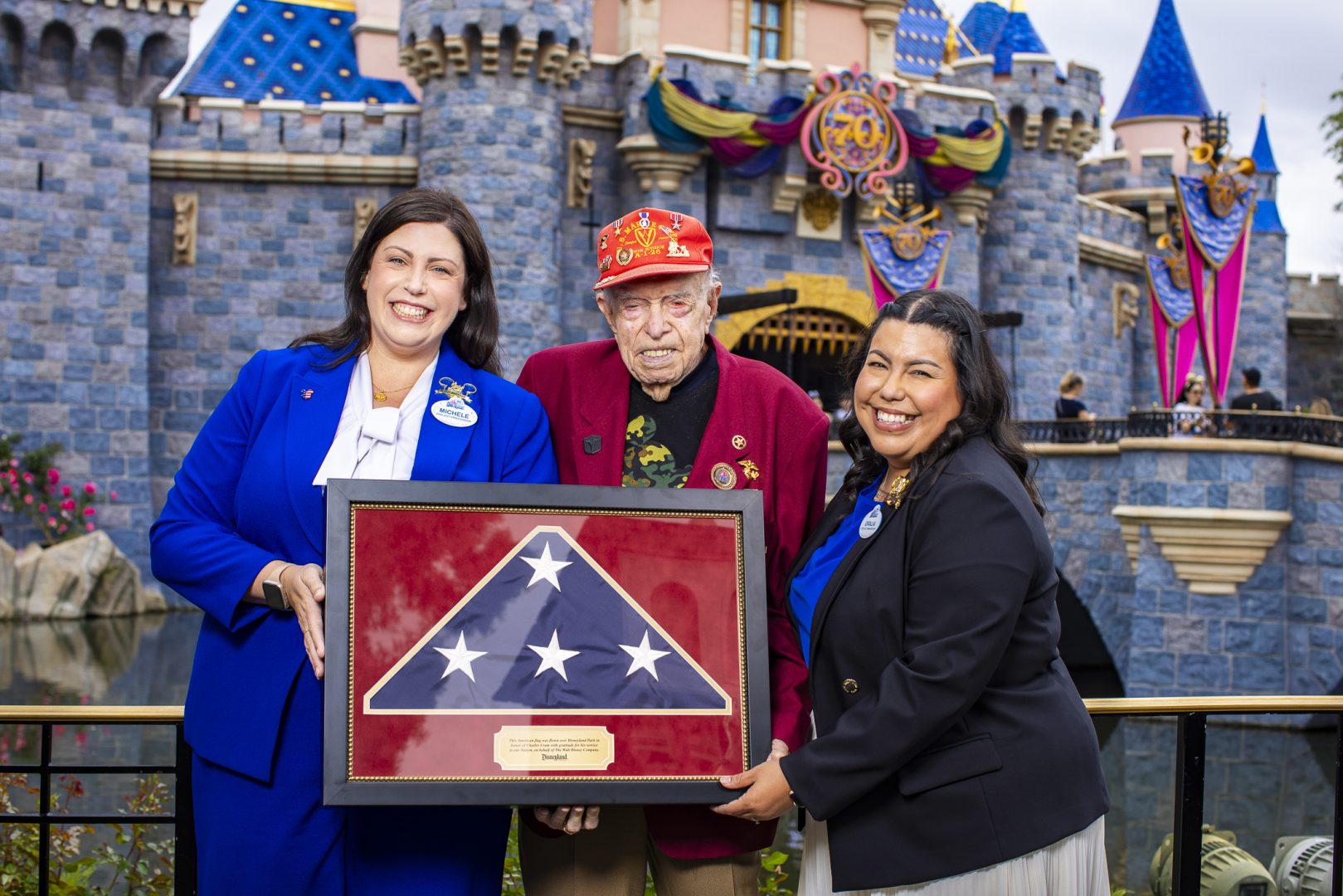 During an emotional moment in the Sleeping Beauty Castle Gardens, Charles was presented with a special gift; a shadow box with an American Flag that had been flown over the iconic theme park in appreciation for his valiant service to our nation.