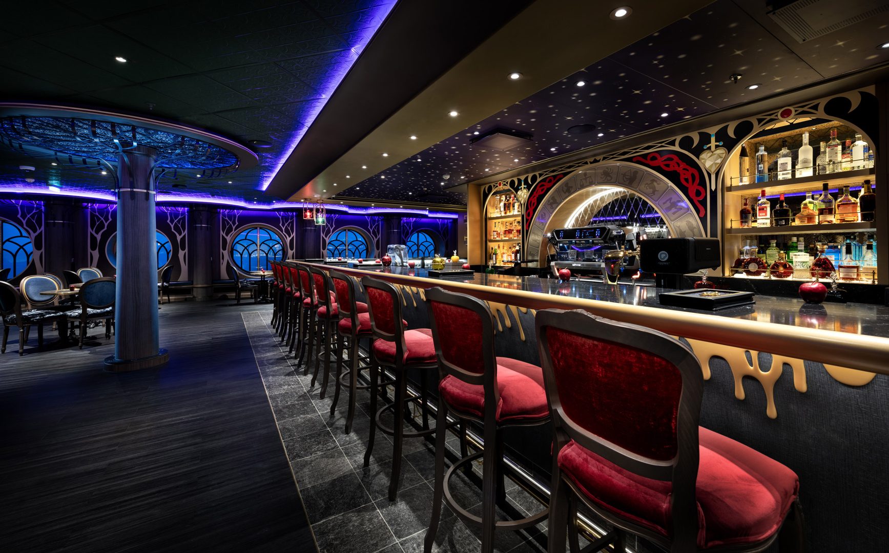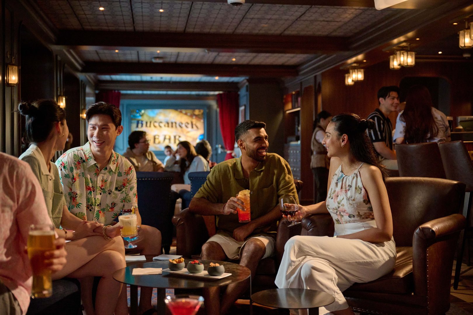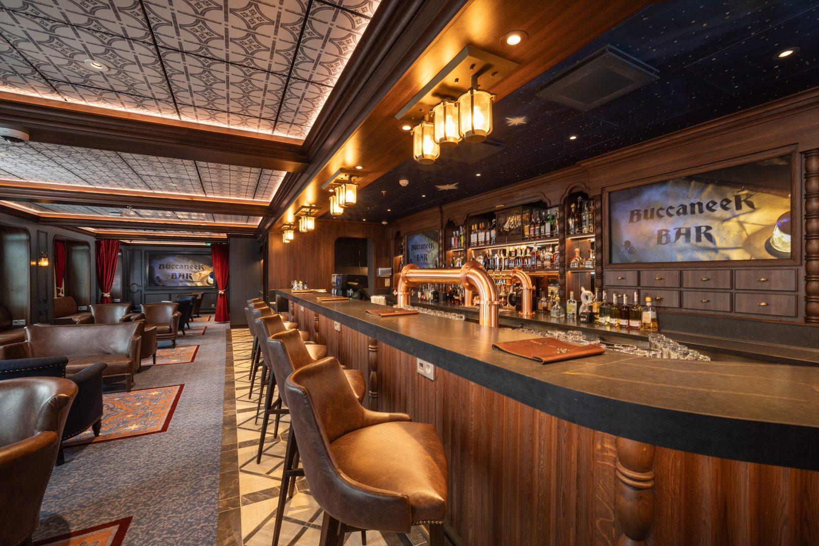 Buccaneer Bar is a swashbuckling pub on the Disney Adventure inspired by the devious Captain Hook from Disney’s “Peter Pan.” Guests feel like the captain of their own high seas adventure as they sip high-end brews, watch live sporting events and soak in the ocean views through the venue’s many oversized portholes. (Preston Mack, photographer)