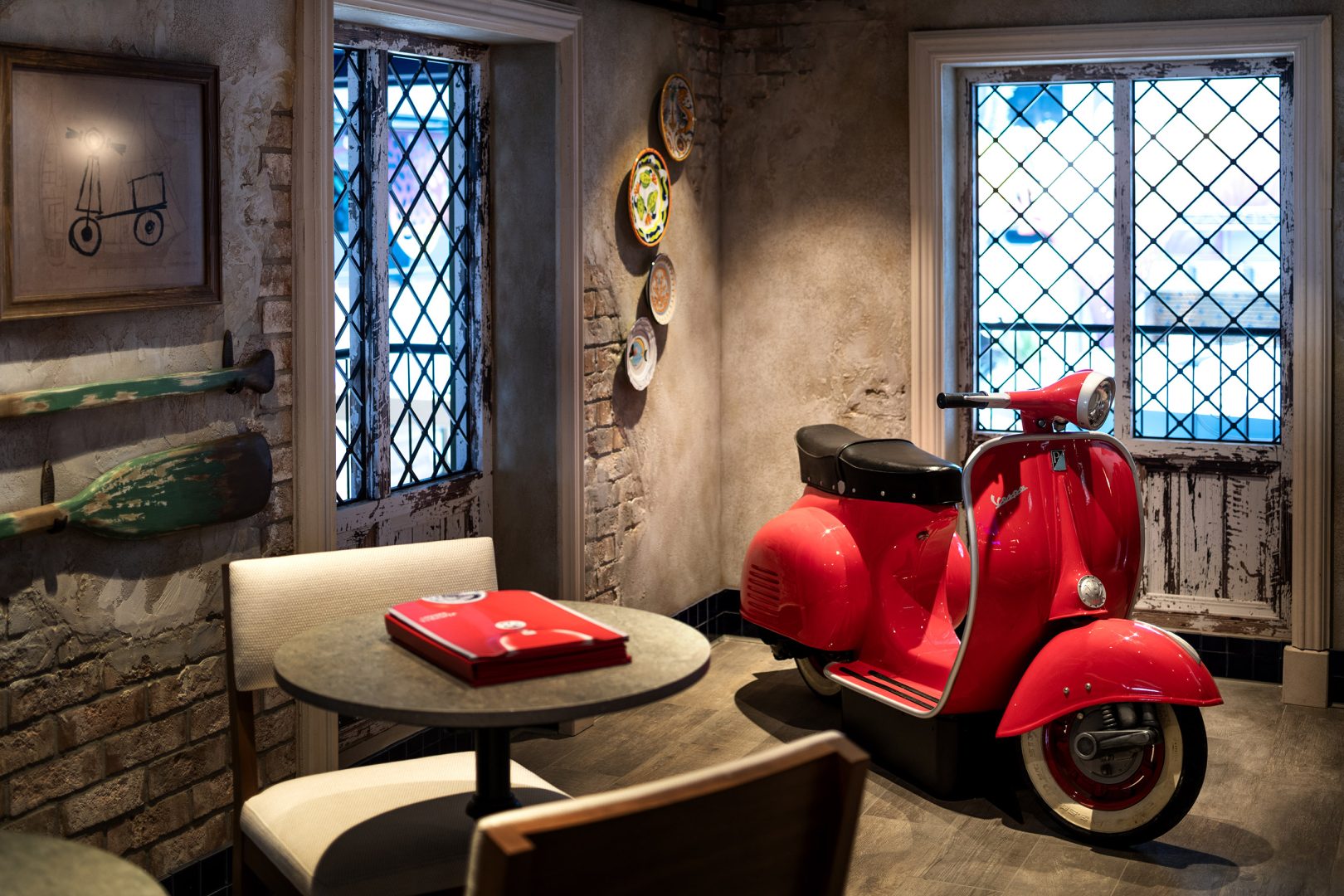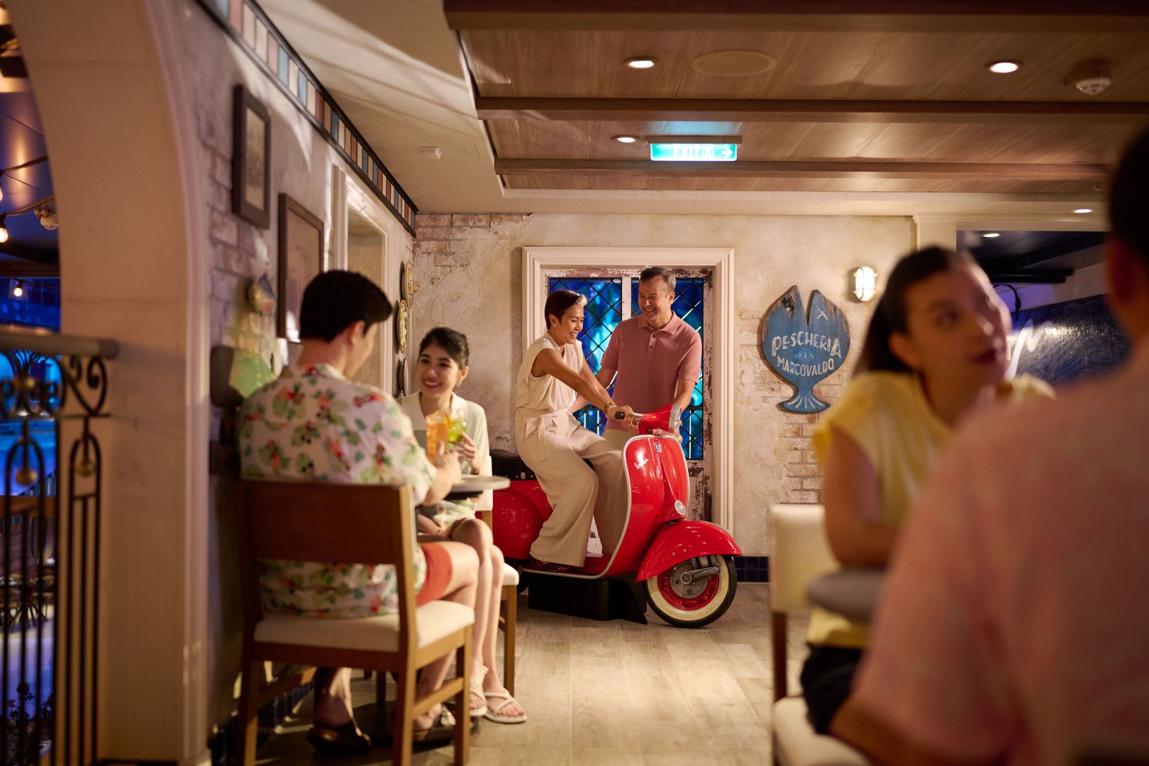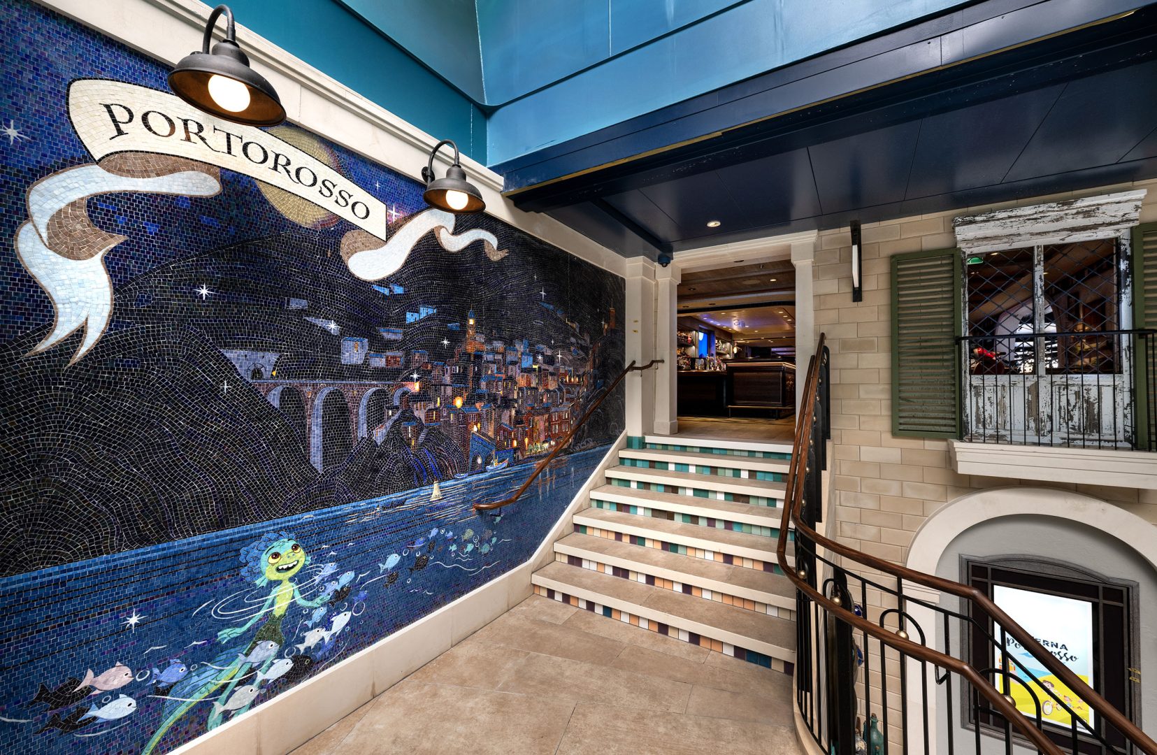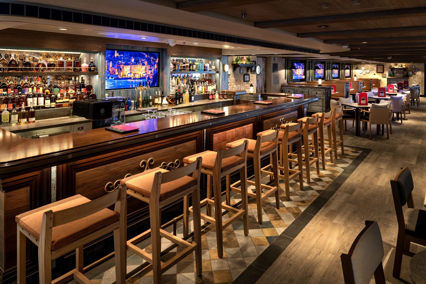 Taverna Portorosso on the Disney Adventure is an intimate and picturesque sports bar where guests enjoy beverages, watch a game, and enjoy the view of the bustling breezeway below. (Matt Stroshane, Disney)