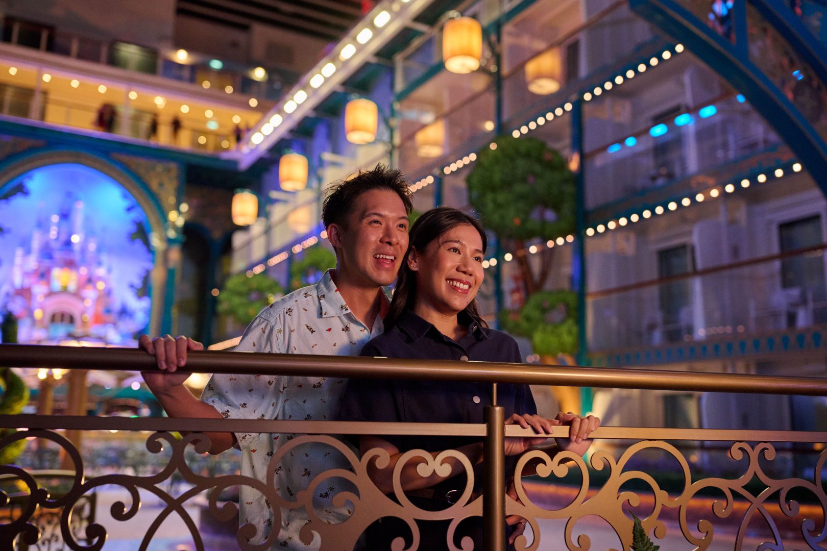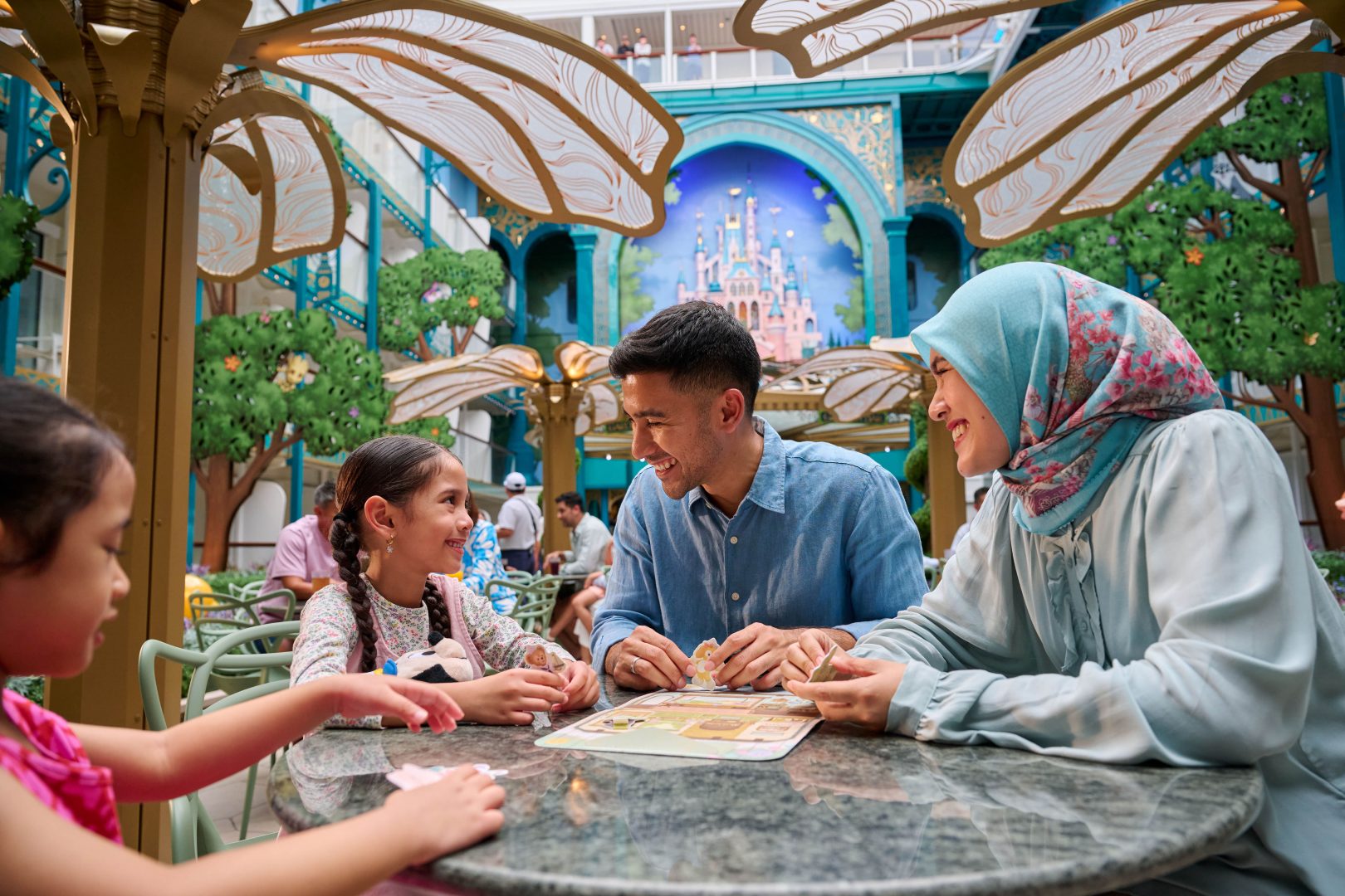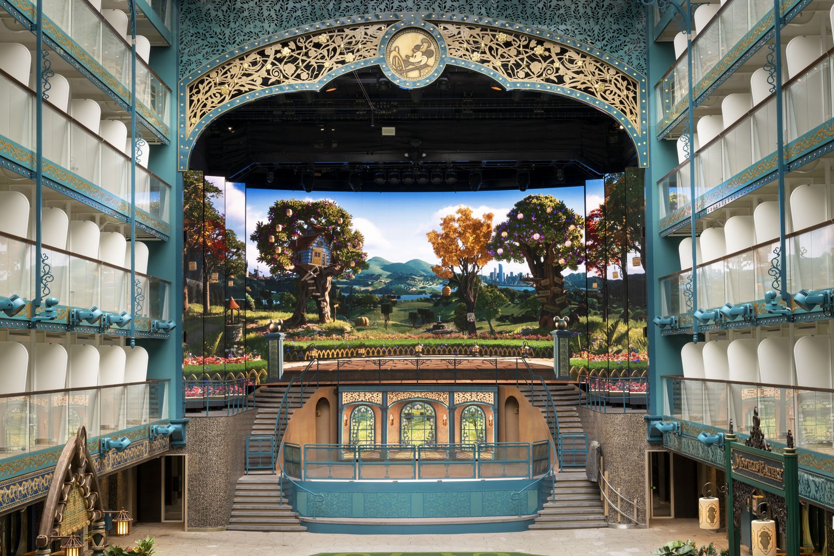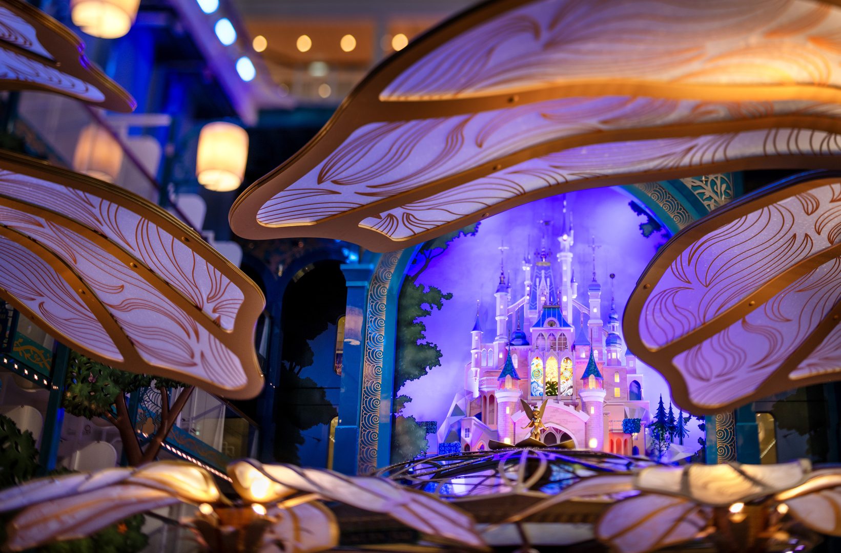 At the heart of the Disney Adventure is Disney Imagination Garden, which transports guests into the pages of a fairy-tale storybook inspired by a century of heroic and heartwarming Disney adventures. The garden features a storybook castle standing three decks tall—a first-of-its-kind art piece for the Disney Cruise Line fleet—bringing beloved fairy tales to life. (Kent Phillips, photographer)