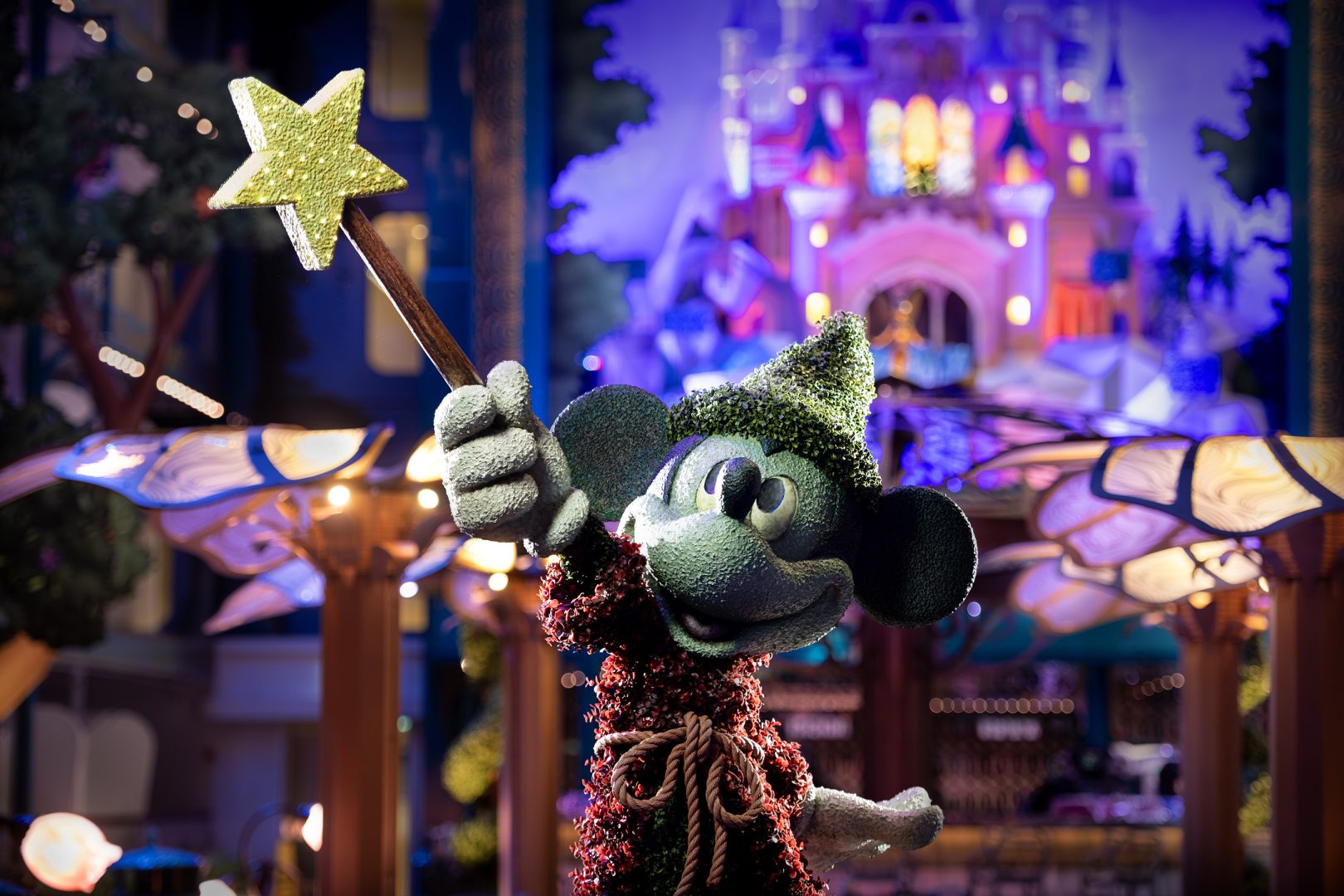 At the heart of the Disney Adventure is Disney Imagination Garden, which transports guests into the pages of a fairytale storybook inspired by 100 years of heroic and heartwarming Disney adventures. Orchestrating the courtyard symphony of storytelling is a topiary of Sorcerer’s Apprentice Mickey Mouse, with his wand held high as if he is conjuring this magical garden where beloved characters and stories bloom to life. (Kent Phillips, photographer)