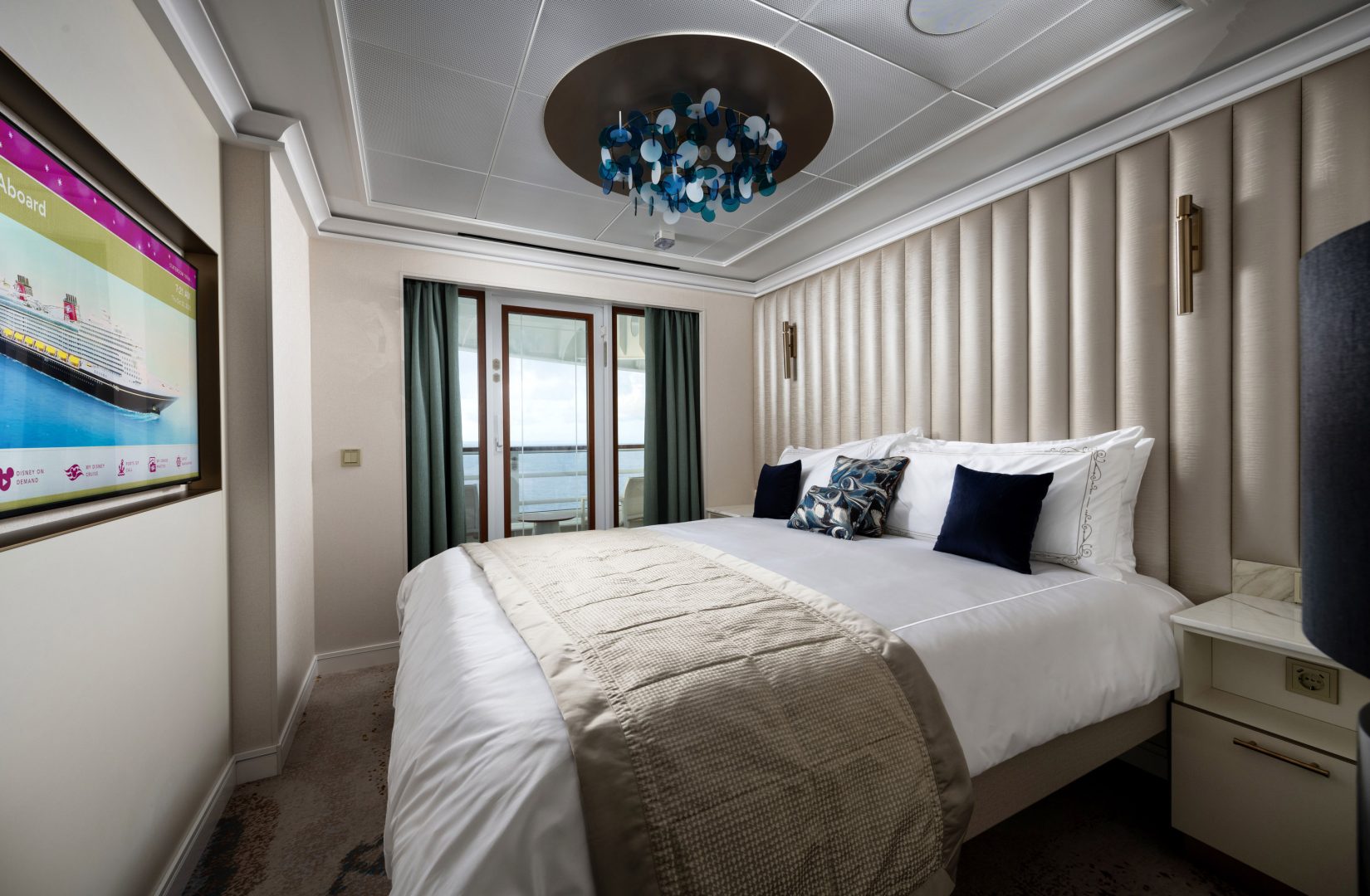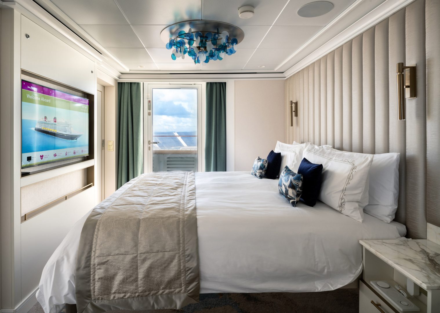 With luxurious accommodations that embrace the duality in every great story, a hero’s welcome awaits guests aboard the Disney Destiny. Each verandah stateroom showcases custom artwork depicting the epic journeys of famous Disney legends and includes features that uniquely meet the needs of families. (Disney) )