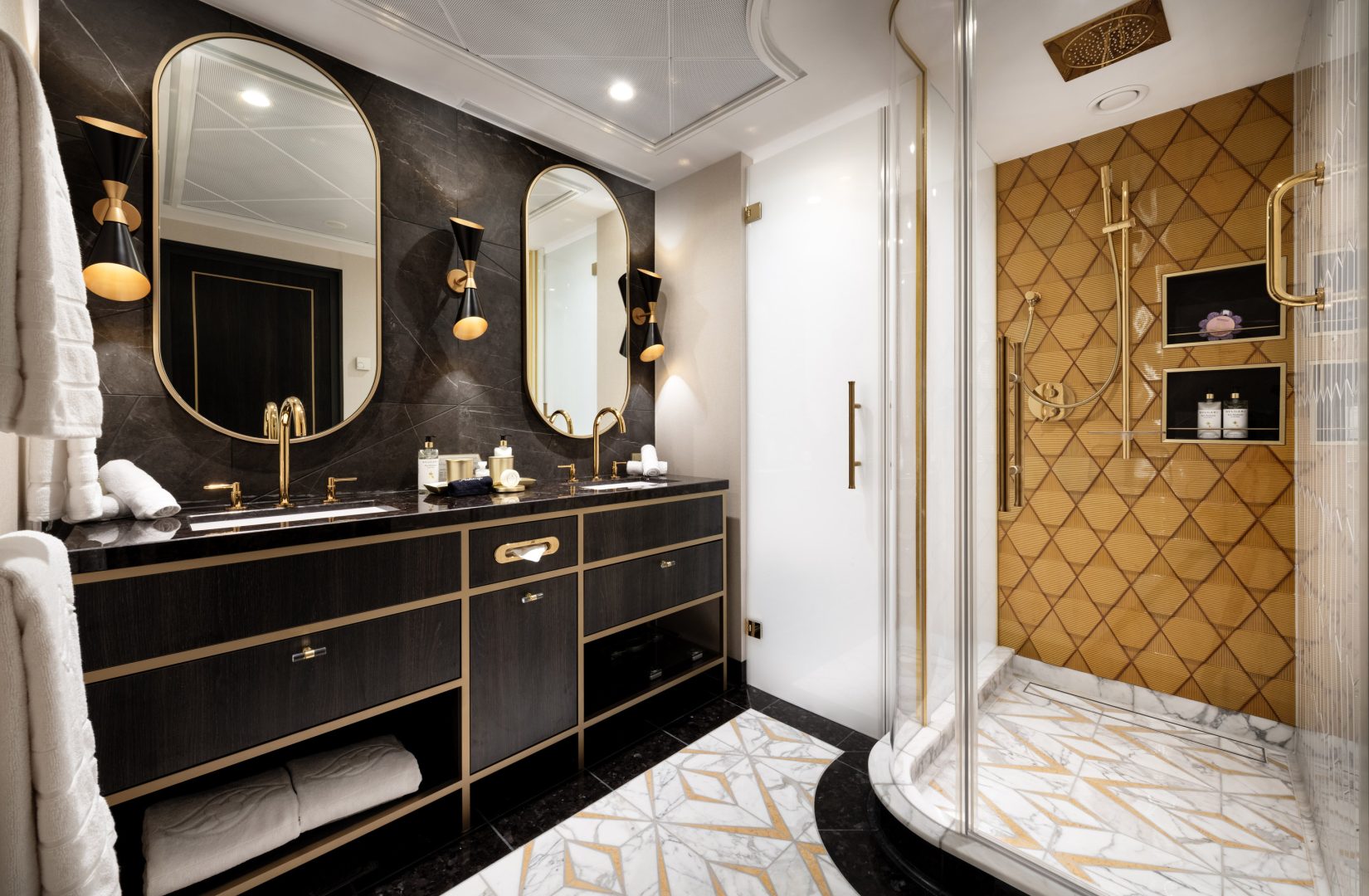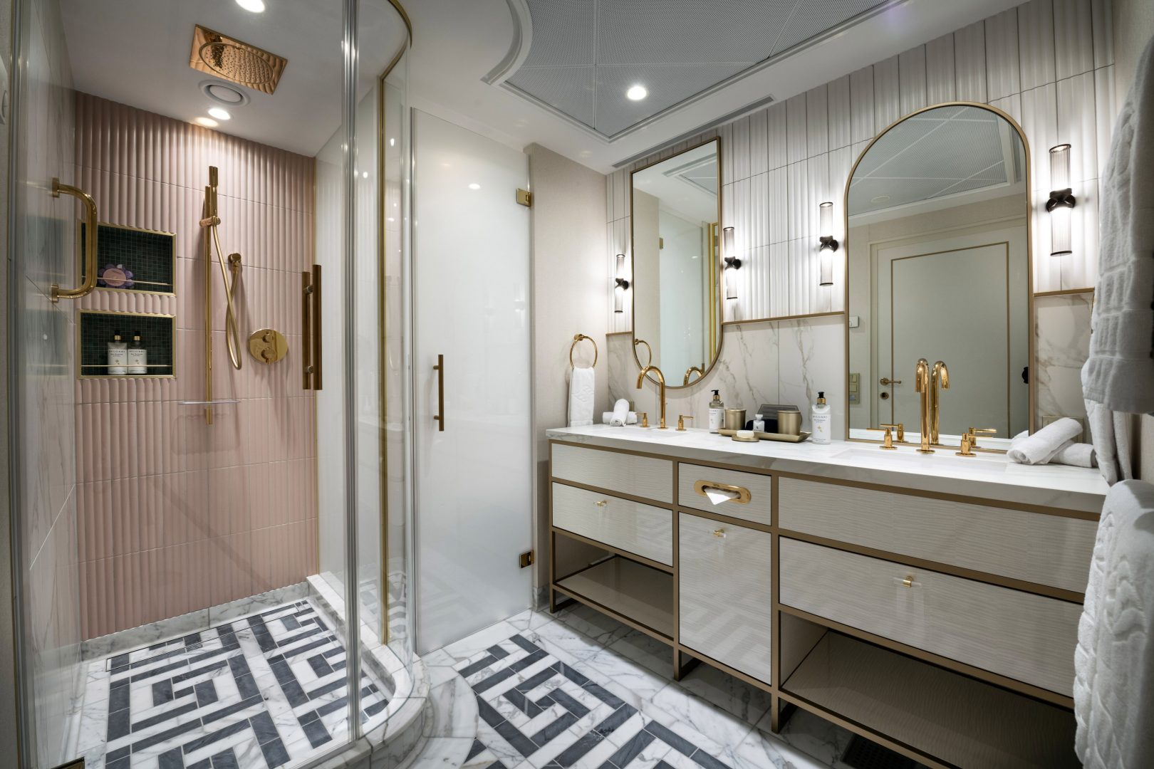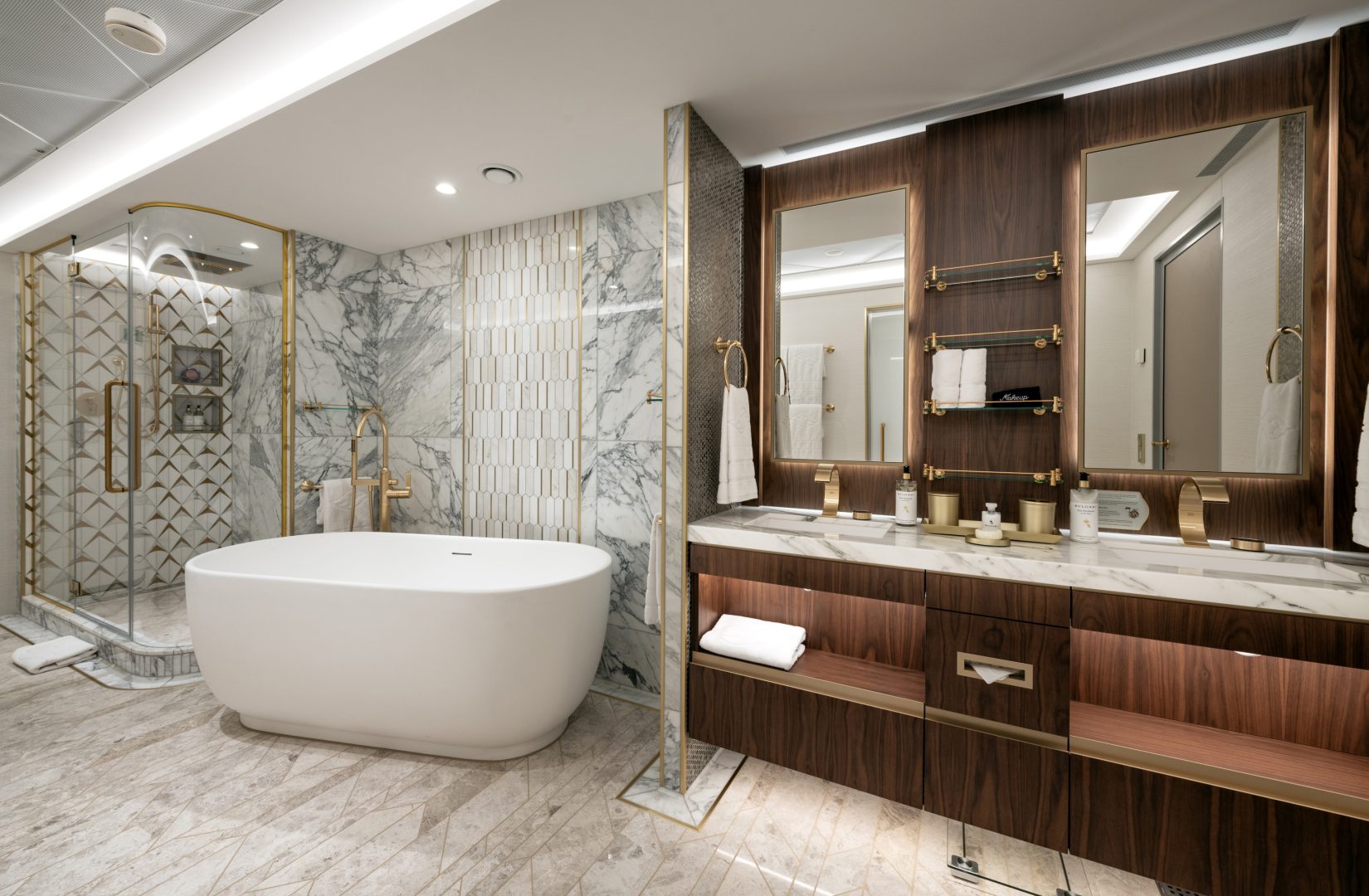 The Destiny Tower Suite honors the mighty legacy of Iron Man with a luxurious take on the sleek, industrial designs of Tony Stark. Located in the ship’s forward funnel, this nearly 2,000-square-foot suite accommodates up to eight guests and offers incredible views through an expansive two-story window; designated areas for eating, sleeping and playing; and other perks like a full kitchen and private ensuite elevator. (Kent Phillips, photographer)