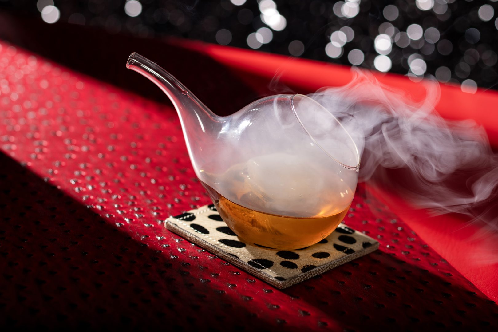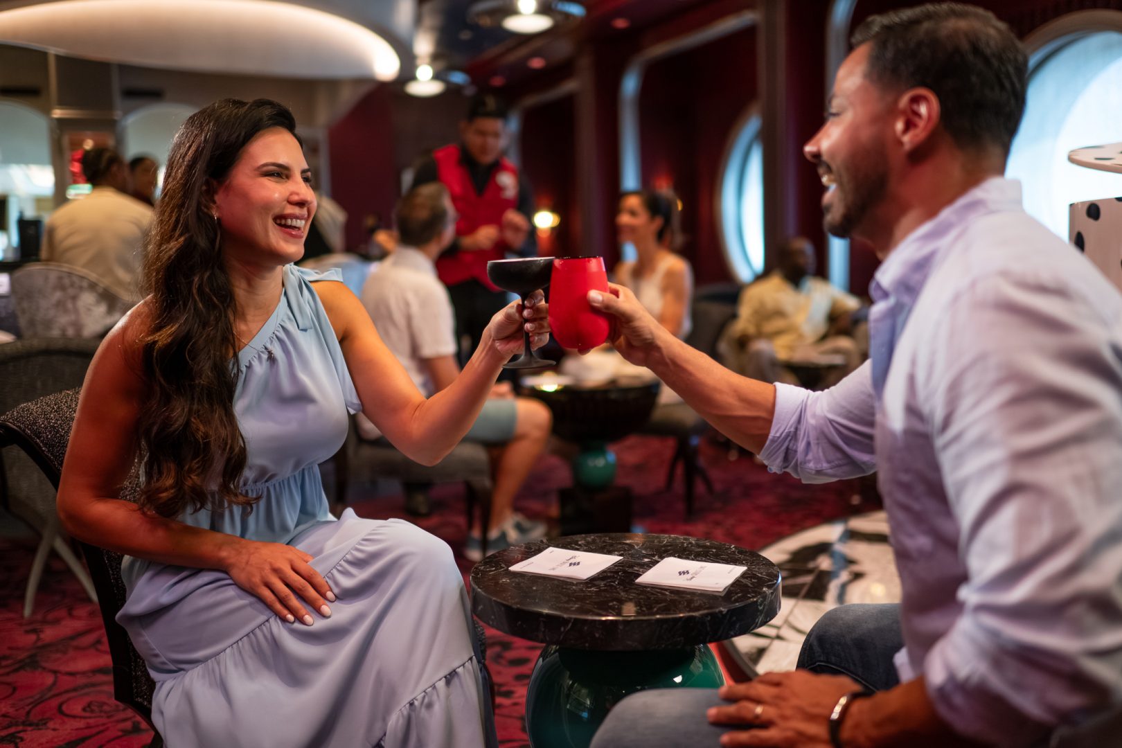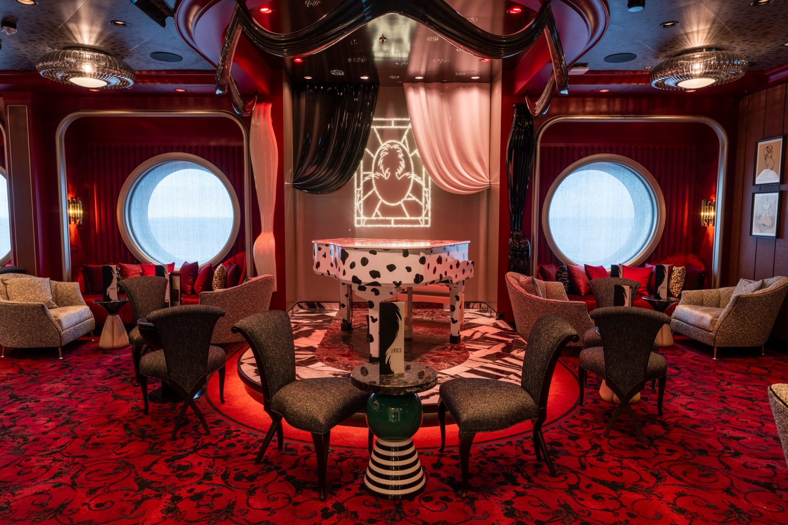 An evening at De Vil’s piano lounge on the Disney Destiny is a lavish affair emblematic of the bar’s namesake, the fabulously over-the-top villain Cruella de Vil of Walt Disney Animation Studios’ “One Hundred and One Dalmatians” and the acclaimed 2021 live action film. Amid sultry tunes from the spotted piano, guests can wind down in style with trendy martinis, chic cocktails, and glamorous wines and bubblies. (Steven Diaz, photographer)
