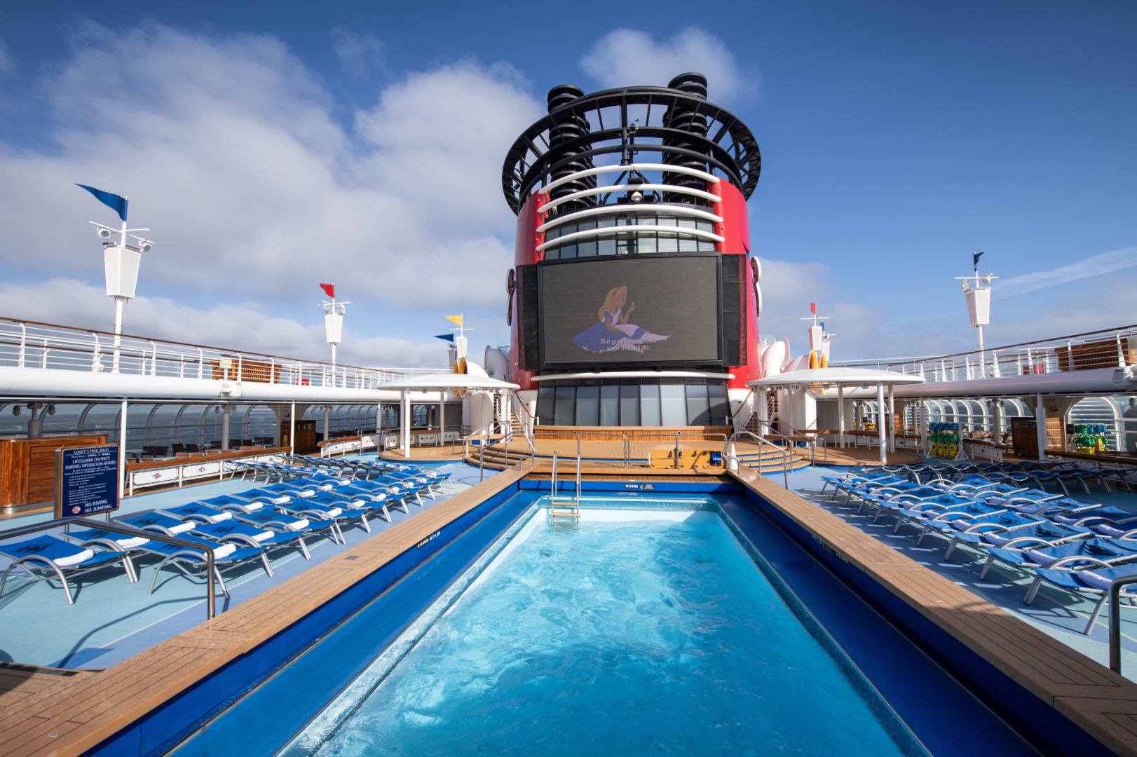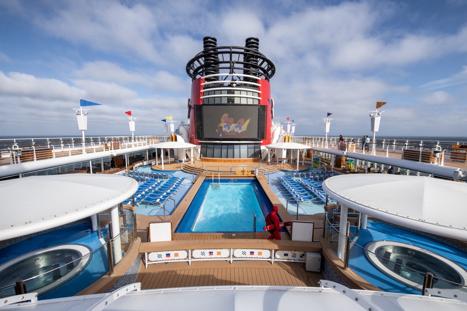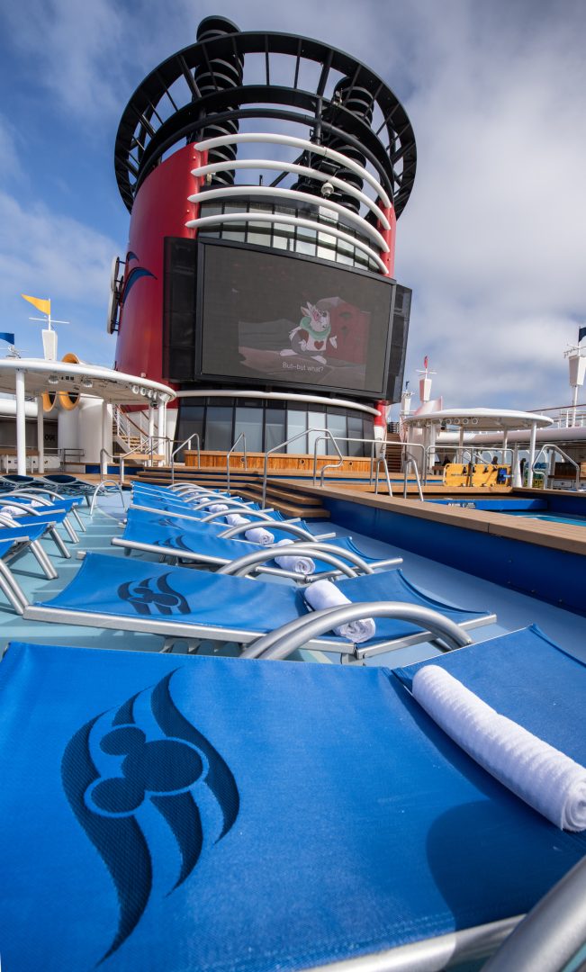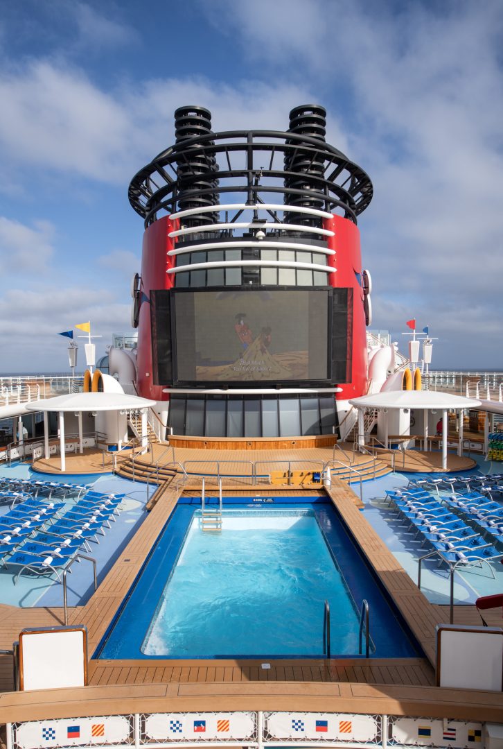 Goofy’s Pool is a place where families gather to enjoy all of the activities up on deck. Overlooking Donald’s Pool, the giant Funnel Vision LED screen, more than 30 feet wide and 18 feet high, shows Disney films, television shows and live broadcast events. (Kent Phillips, photographer) ©Disney