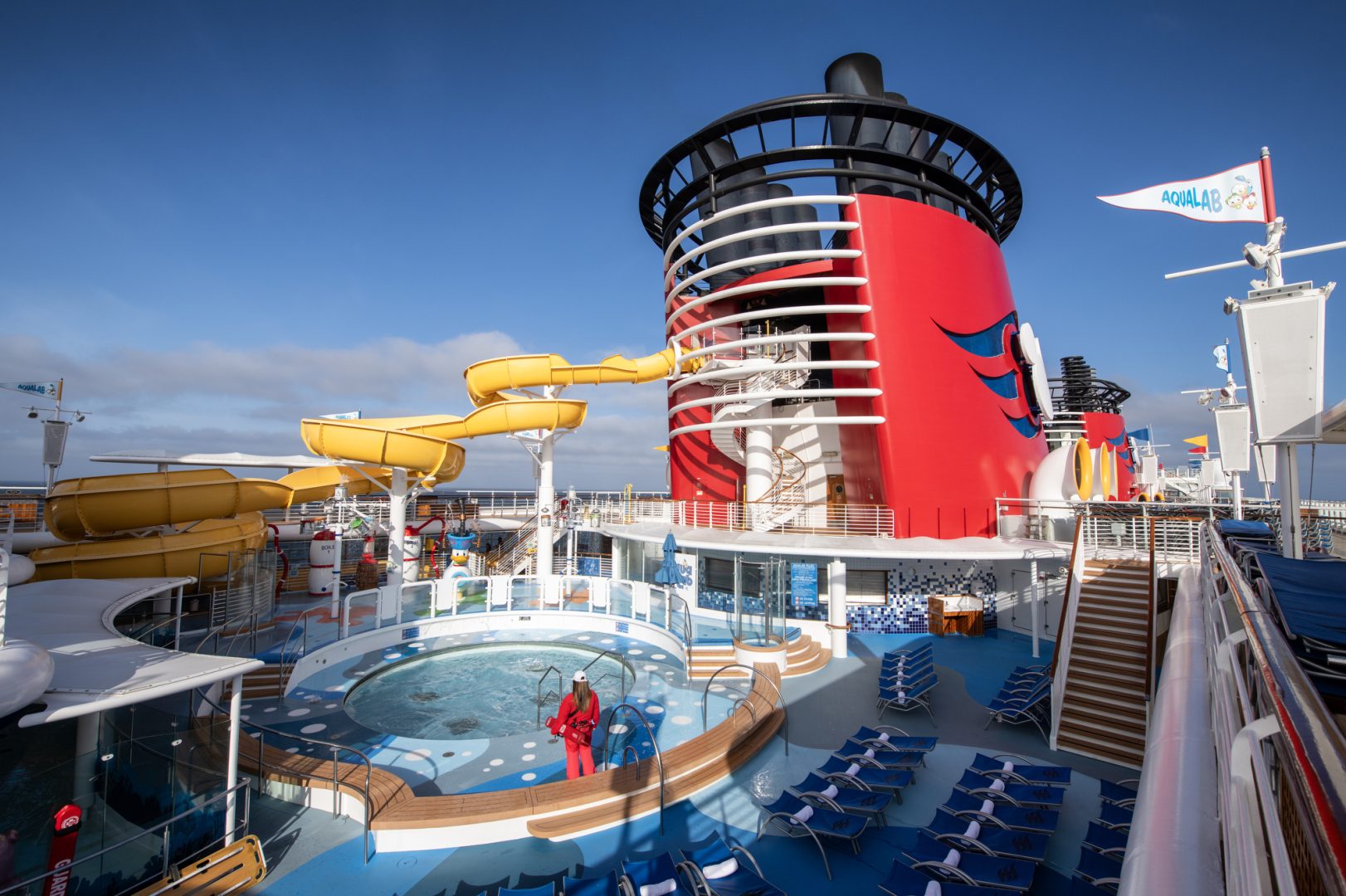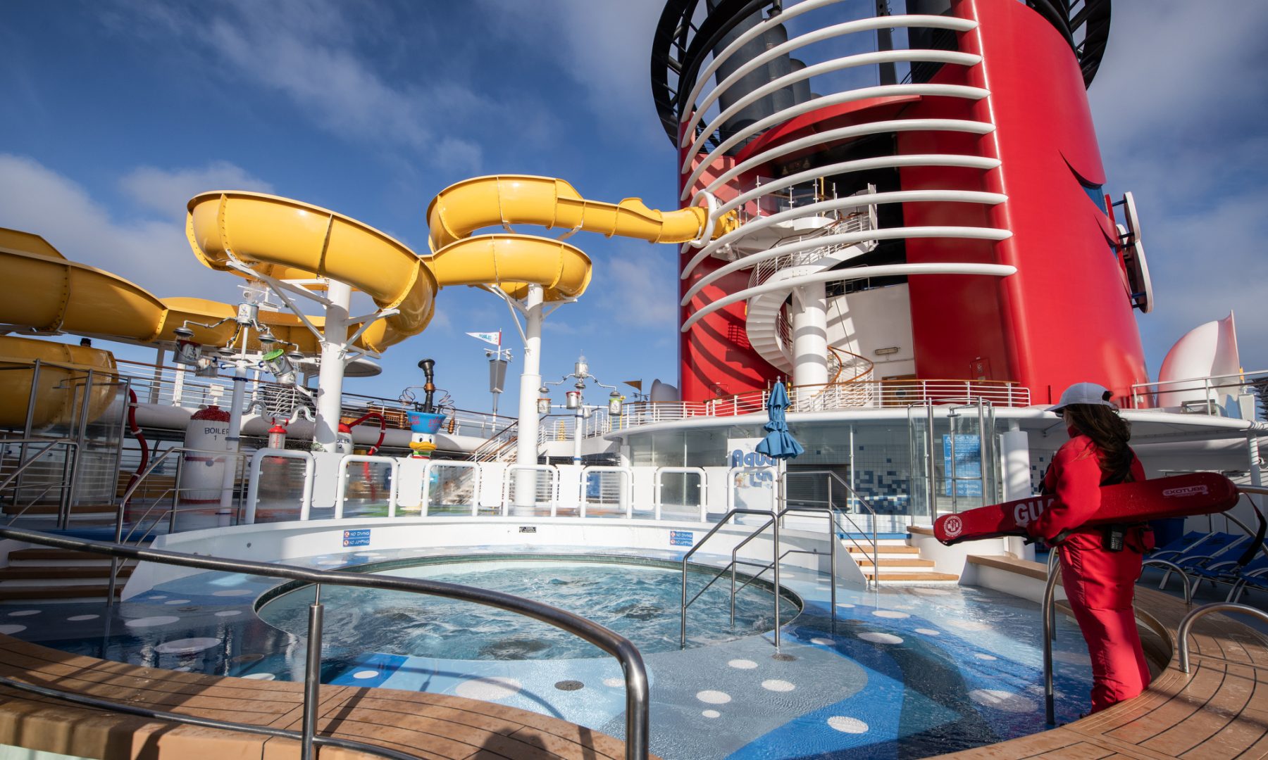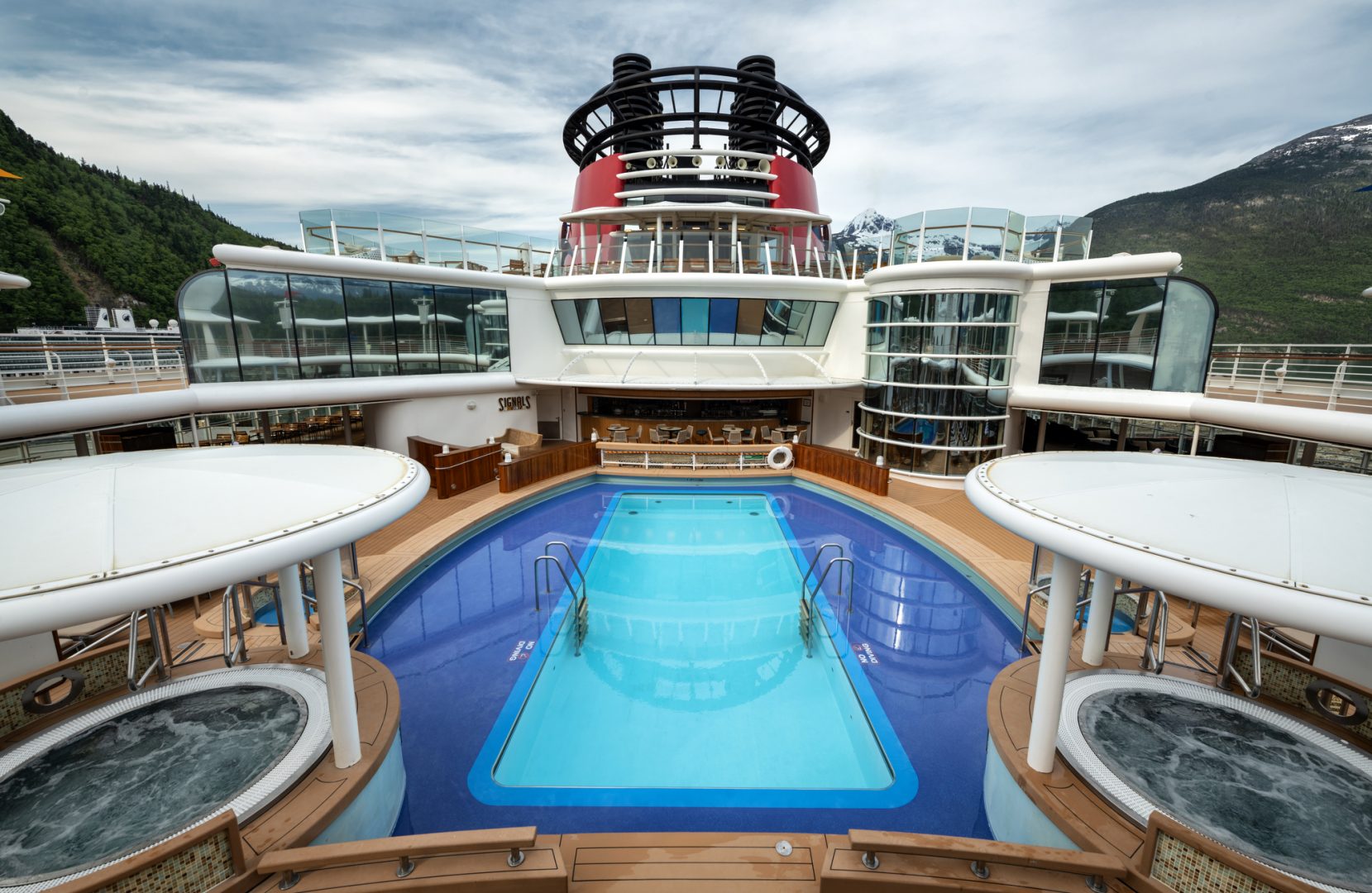 Goofy’s Pool is a place where families gather to enjoy all of the activities up on deck. Overlooking Donald’s Pool, the giant Funnel Vision LED screen, more than 30 feet wide and 18 feet high, shows Disney films, television shows and live broadcast events. (Kent Phillips, photographer) ©Disney