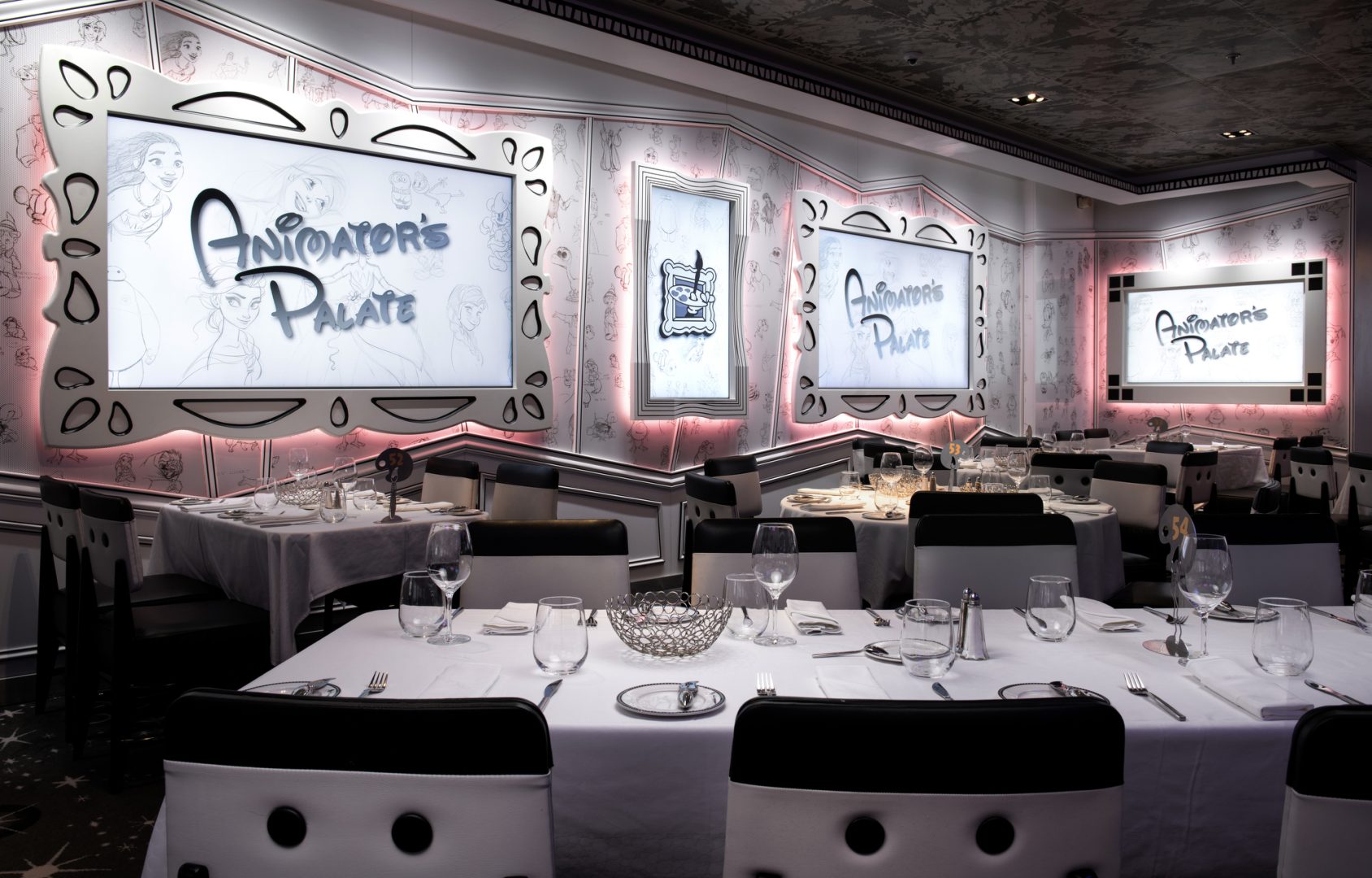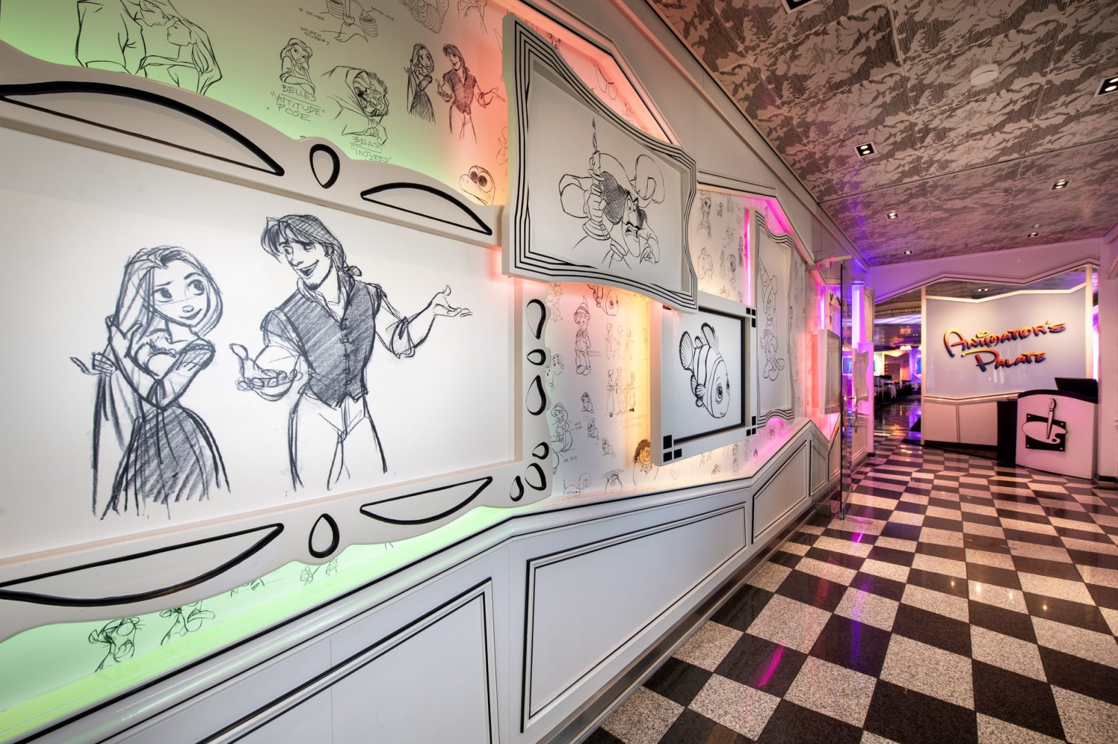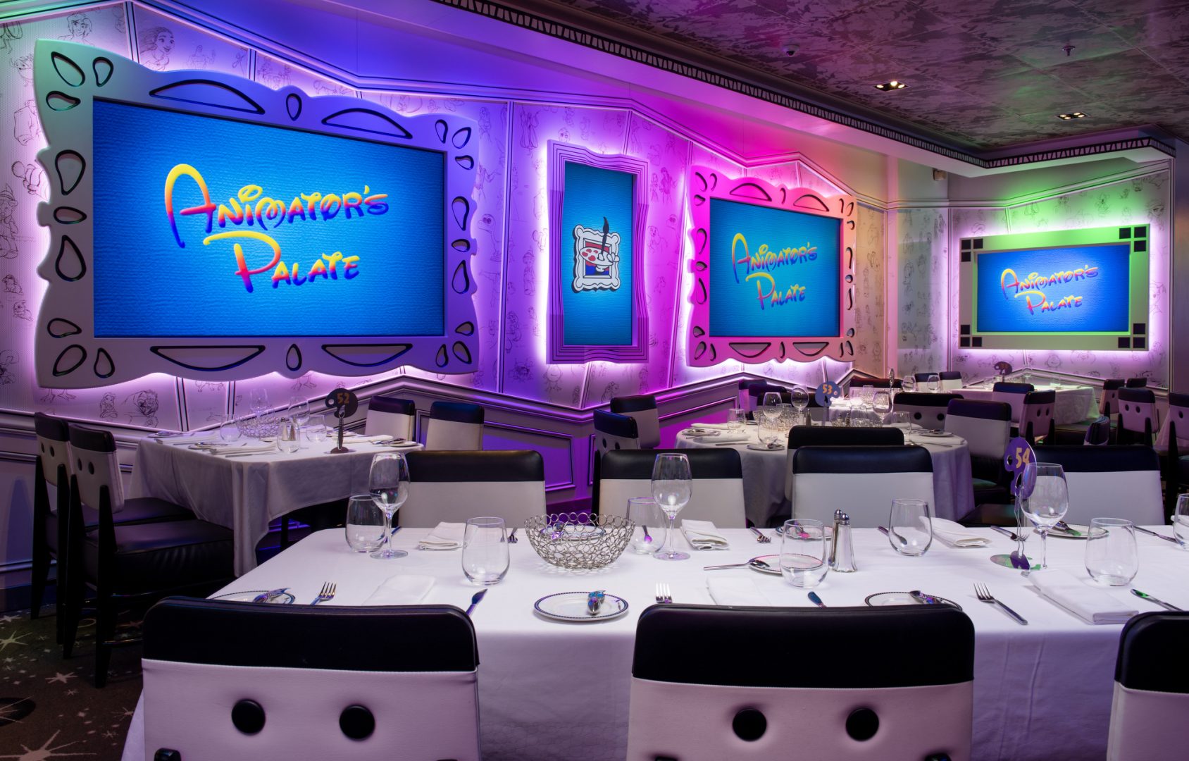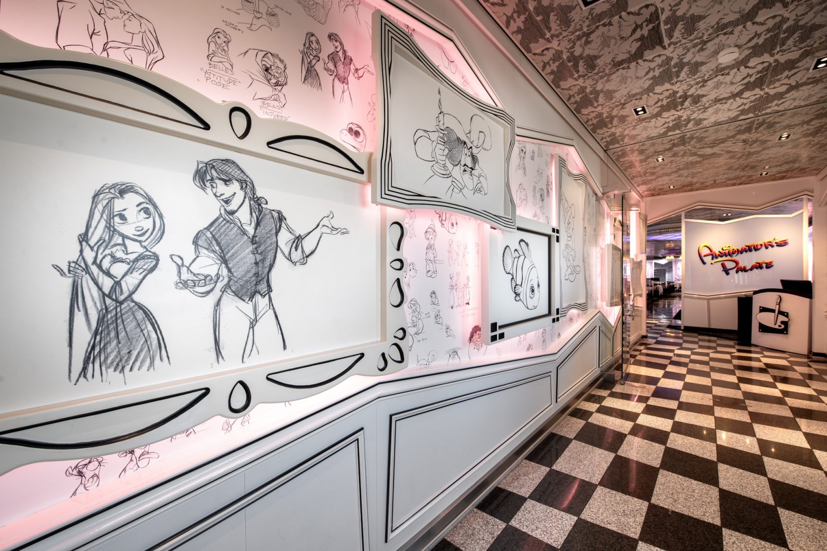 At Animator’s Palate, one of the family dining restaurants on the Disney Wonder, the room comes to life as guests are immersed in the wonder of Disney animation during magical interactive dinner shows. (Matt Stroshane, photographer) ©Disney