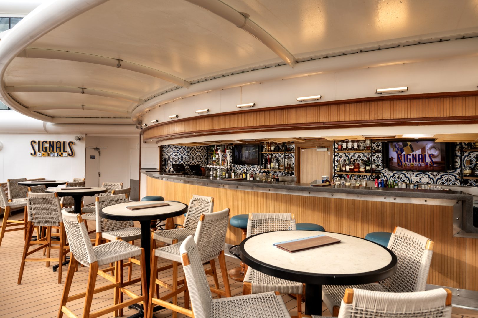 Adults aboard the Disney Wonder have a space all their own in Cove Café, an exclusive retreat redesigned as a coffee shop for world travelers, complete with warm, comfortable and trendy décor. With ample seating and ocean views, Cove Café is the perfect place to sip a specialty coffee or tea throughout the day and indulge in wine or a cocktail and light bites during the evening hours. (Kent Phillips, photographer) ©Disney