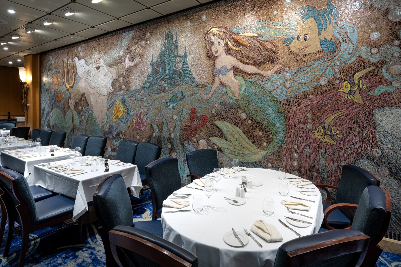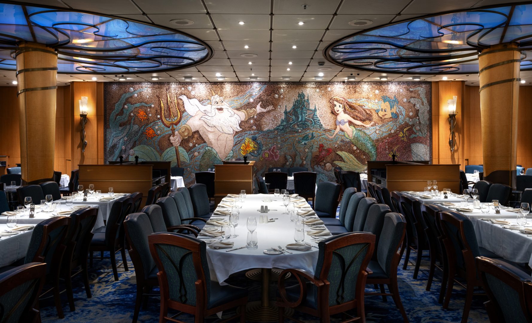 Triton’s is a sophisticated venue onboard the Disney Wonder inspired by the ‘under the sea’ theme of Disney’s “The Little Mermaid,” featuring continental cuisine with a French flair. Brimming with ornate chandeliers, stained glass, sea-inspired architectural flourishes and a sweeping mural of Ariel and her father, Triton's serves up a regal atmosphere that guests of all ages are sure to admire. (Disney) ©Disney