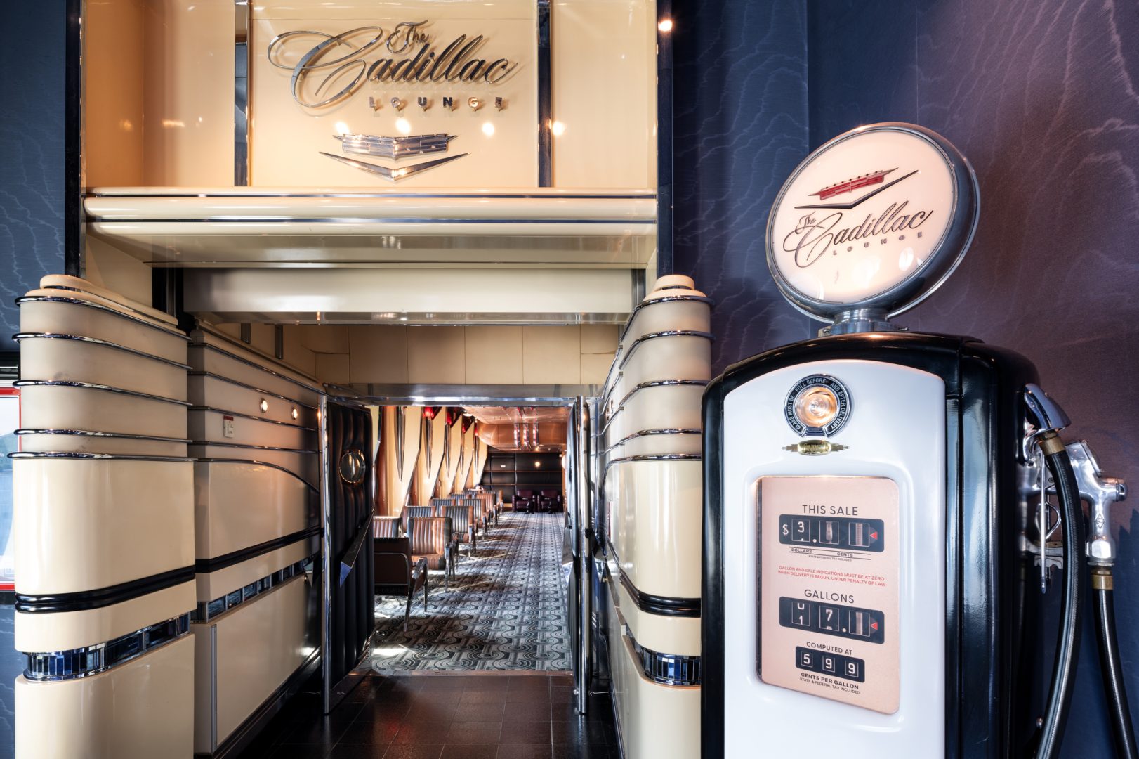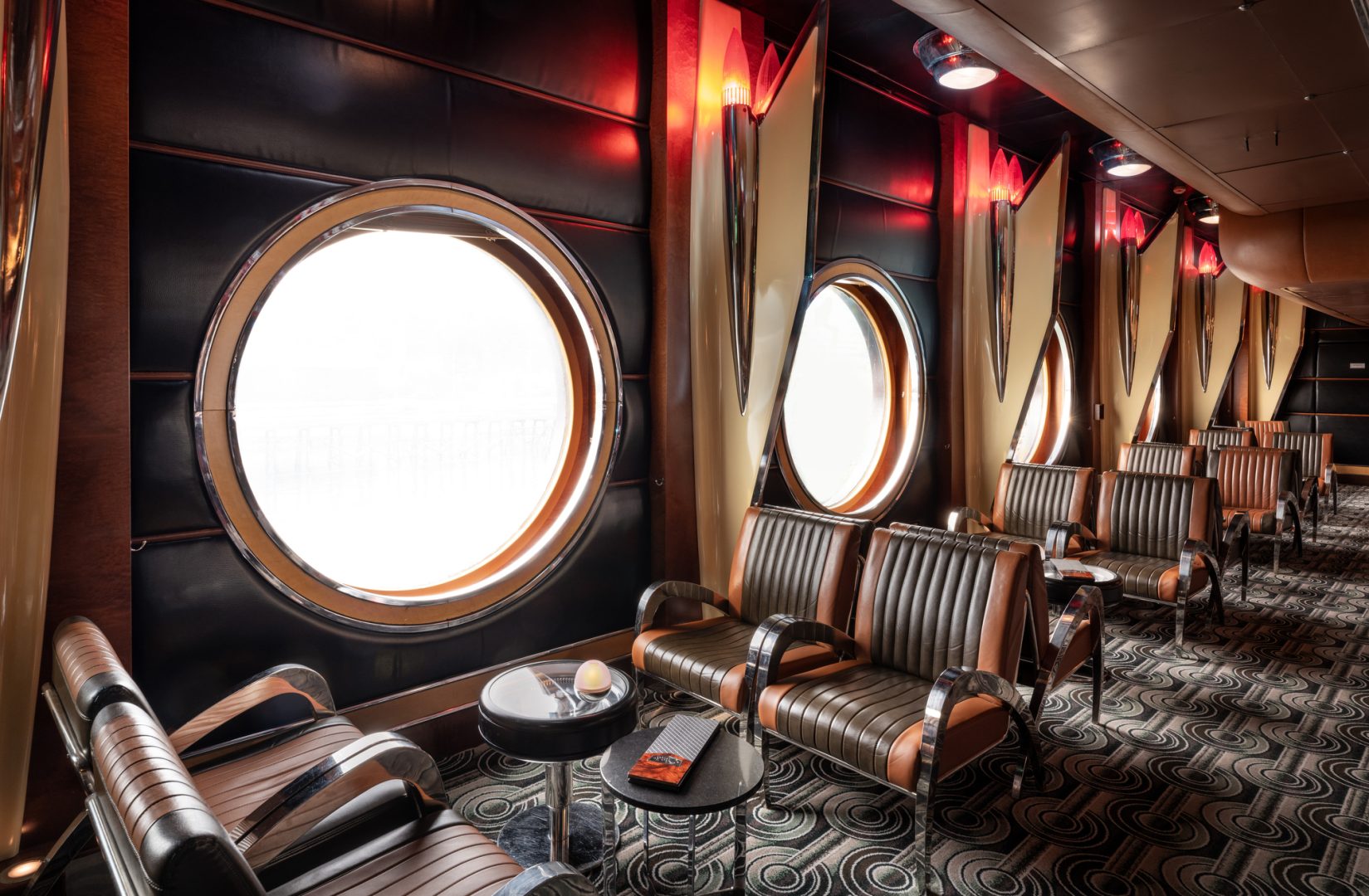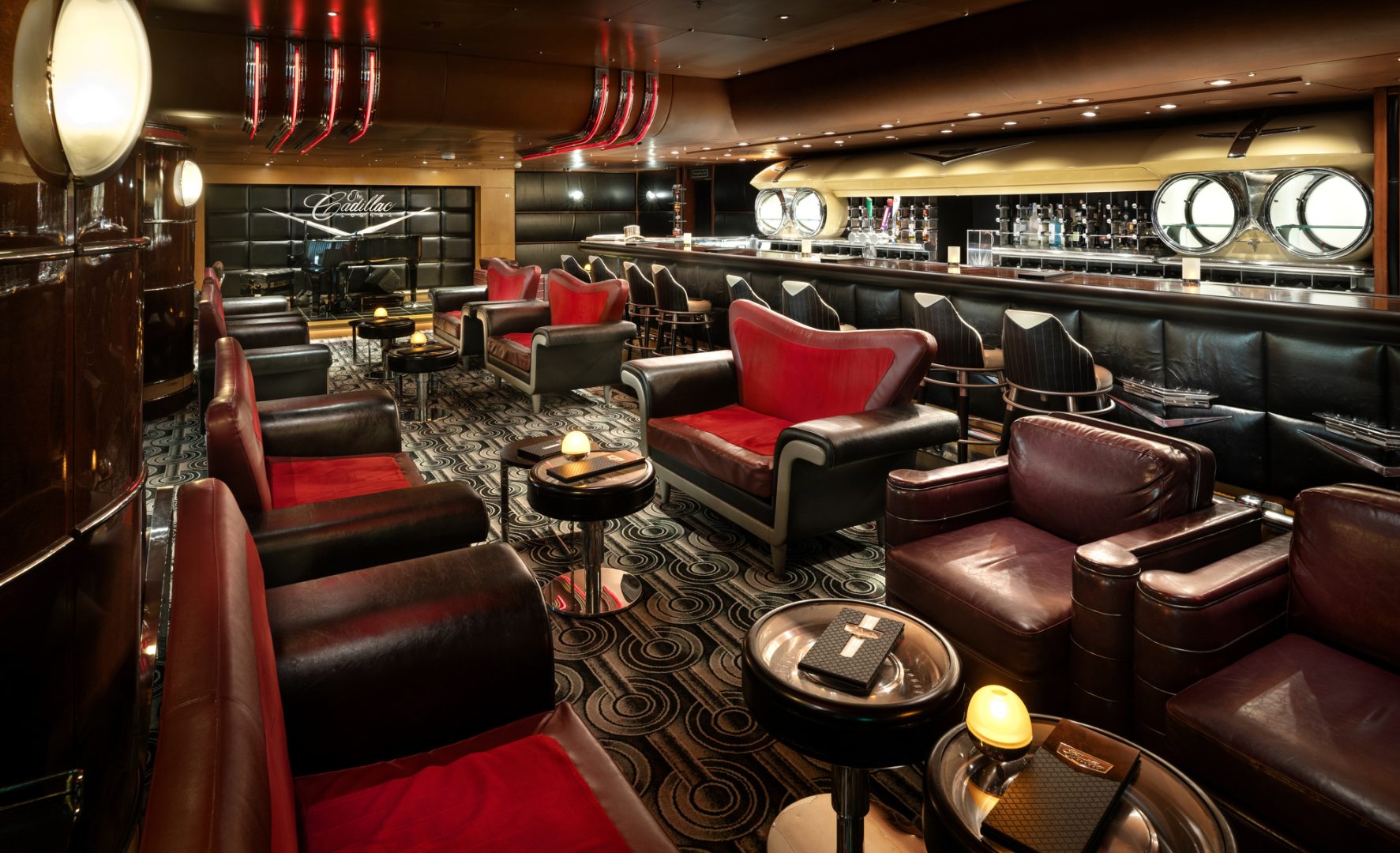 Cadillac Lounge is an intimate piano bar, providing a romantic atmosphere for adults and couples looking to park themselves amid a more relaxed and upscale setting. Overstuffed armchairs, large porthole windows and a bucket-seat bar add to the cozy setting. (Kent Phillips, photographer) ©Disney