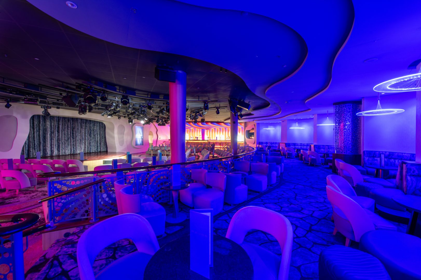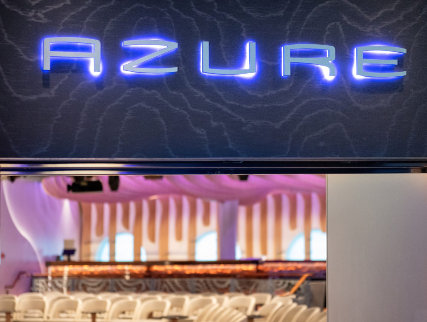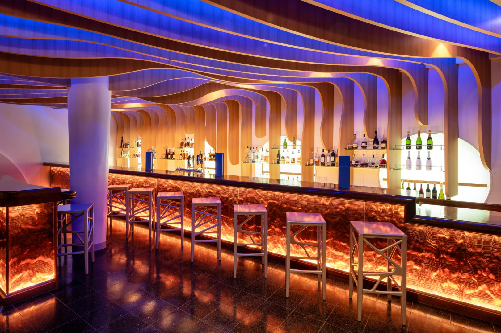 Aboard the Disney Wonder, Azure is an adults-only hotspot inspired by the shapes, colors, sounds and movements of the sea. The lounge – awash with a bar, dance floor and plenty of seating – features flowing, curvy walls reminiscent of the ever-changing current. (Kent Phillips, photographer) ©Disney