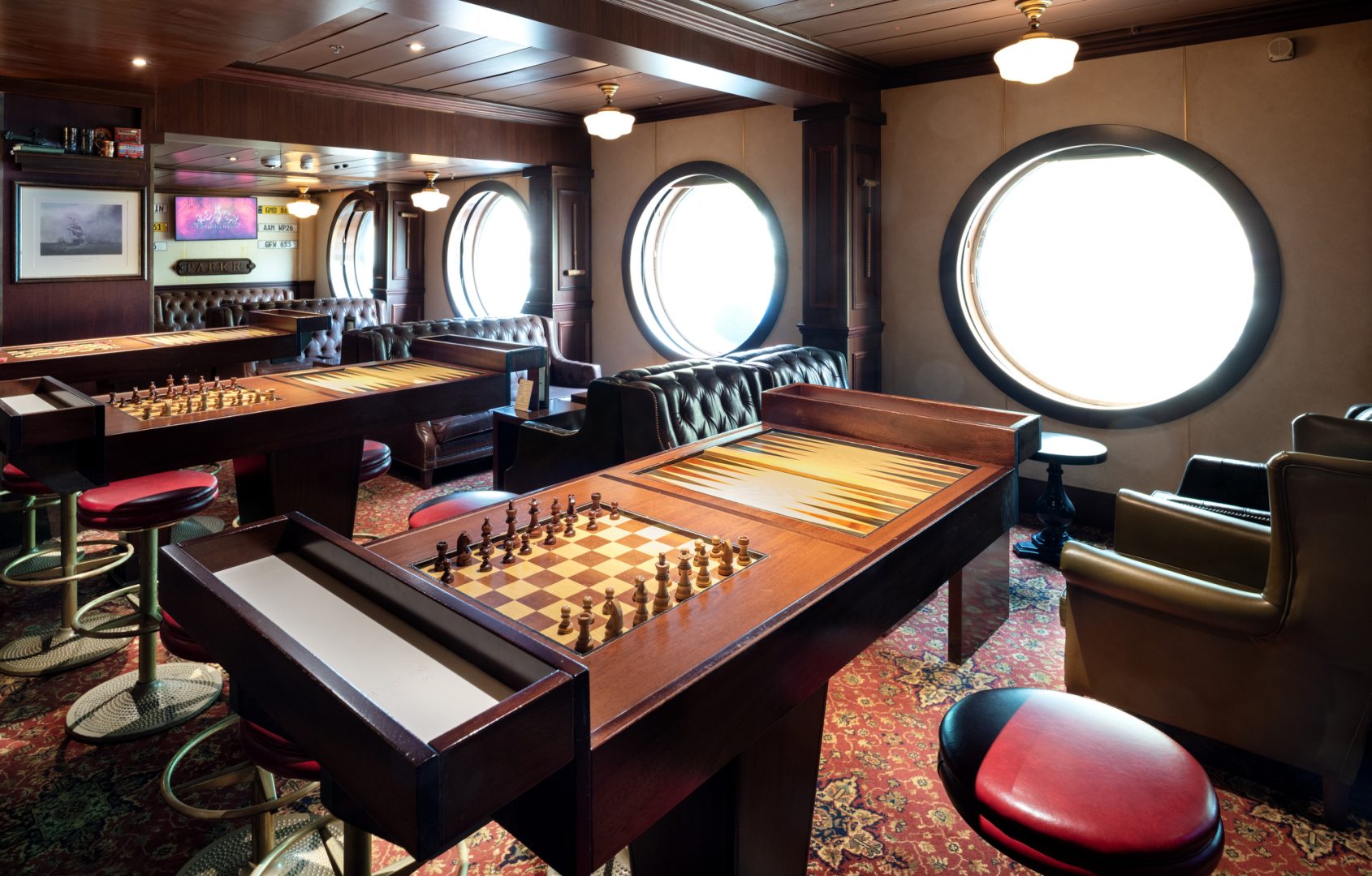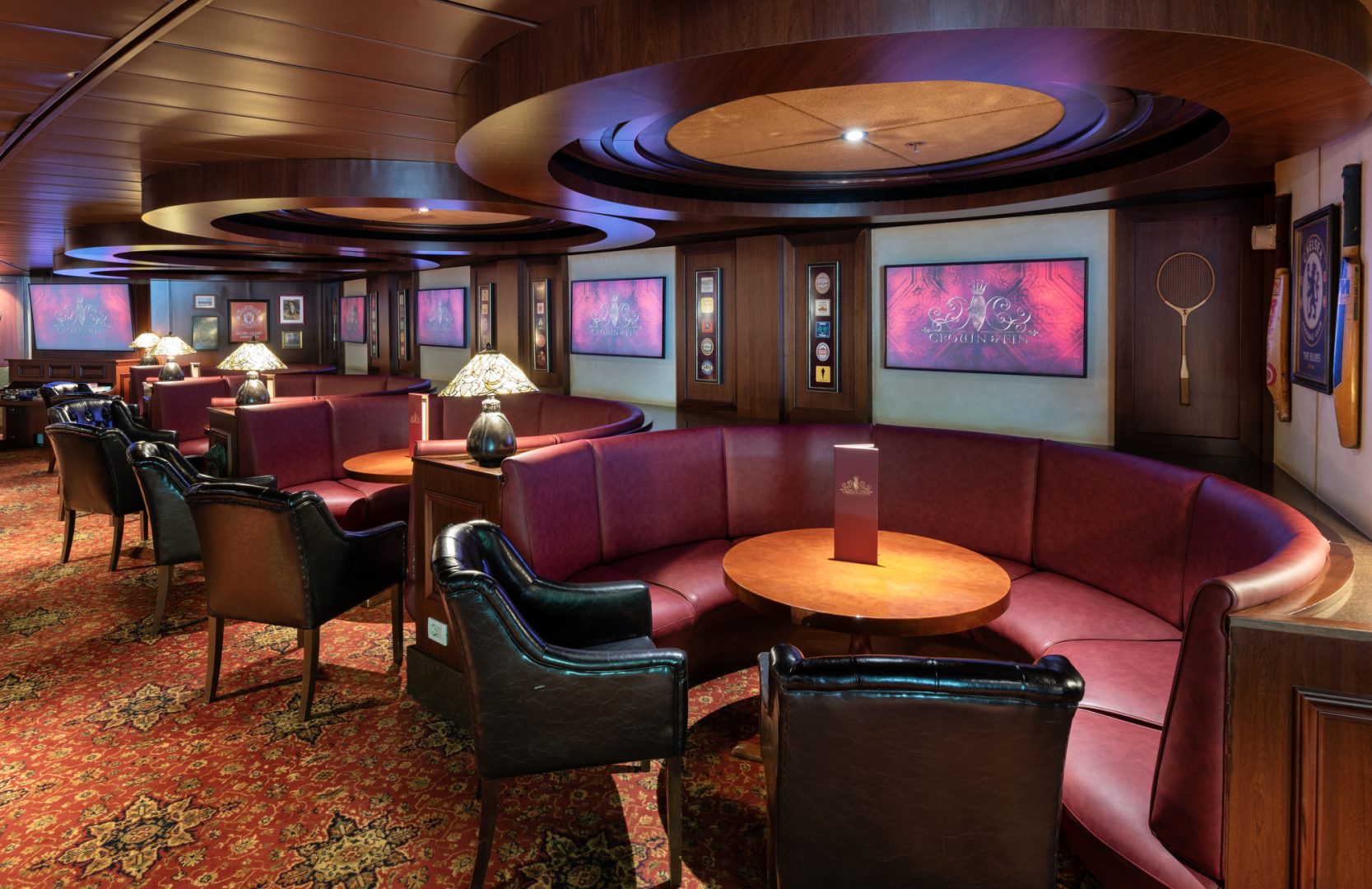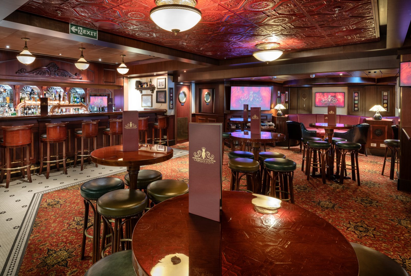 Located in the adult district aboard the Disney Wonder, Crown & Fin Pub resembles a traditional British tavern, with dark woods, plush leather furniture and brass accents. Guests can duck in for a jolly time and a frosty pint while socializing at this inviting and nostalgic bar. (Amy Smith, photographer) ©Disney