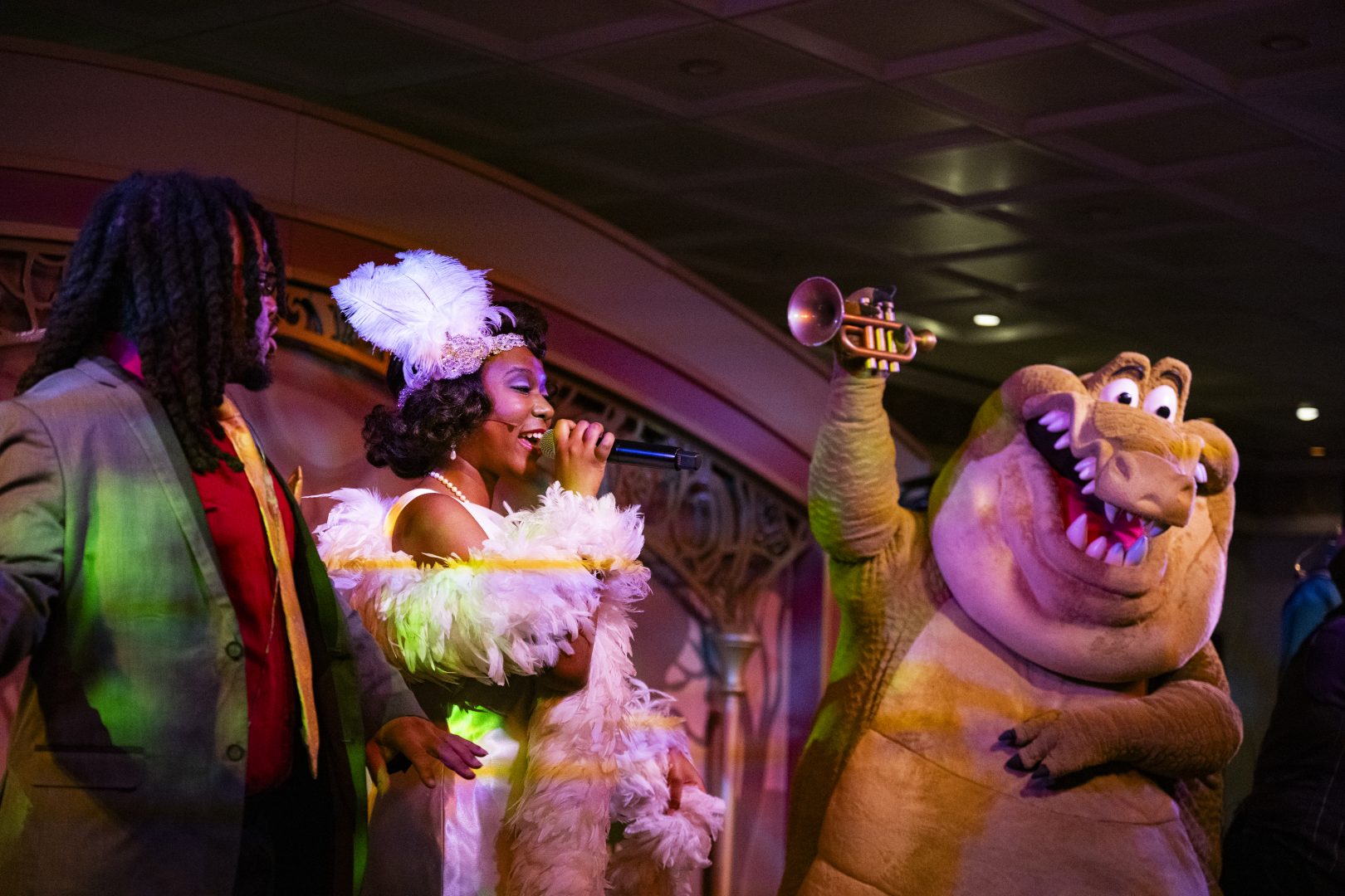 At Tiana’s Place onboard the Disney Wonder, guests are treated to a celebration of New Orleans dining and entertainment inspired by Princess Tiana in the Disney animated feature, “The Princess and the Frog.” Live music is performed on the main stage, with rhythmic, toe-tapping notes of jazz, swing and blues setting the tone for the French Quarter supper club atmosphere. (Kent Phillips, photographer) ©Disney