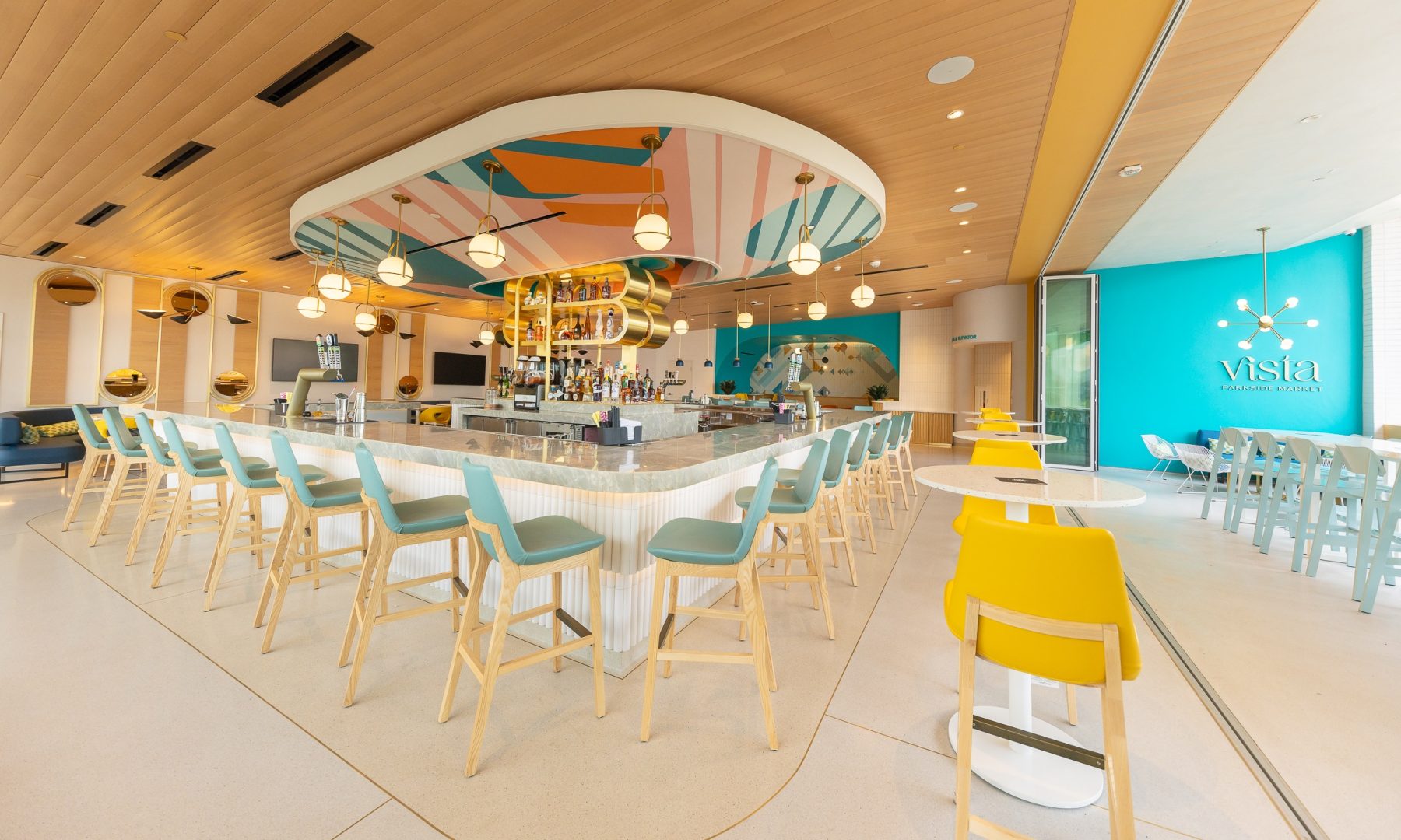 Parkside Market in the Downtown Disney District in Anaheim, Calif., is a new, two-story food hall bringing four distinctive locations under one roof: Vista Parkside Market, pictured here, is situated on the entire upper floor offering seating for all food hall eateries and great views of the district with signature cocktails and mocktails made with local ingredients and artful garnishes; on the first floor, Seoul Sister is a fast-casual modern eatery serving Korean-style rice bowls; Parkside Market Coffee serves lattes, fresh treats, frozen drinks and small bites, and GG’s Chicken Shop serves chicken sandwiches, salads and classic dinner table sides. (Christian Thompson/Disneyland Resort)