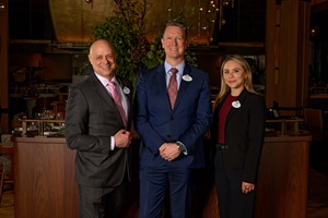 General Manager Jess Soman, Wine Director Patrick Kirchen, and Guest Experience Manager Lisa Karbon pose in the main dining room at Napa Rose at Disney's Grand Californian Hotel & Spa (Ron De Angelis/Disneyland Resort