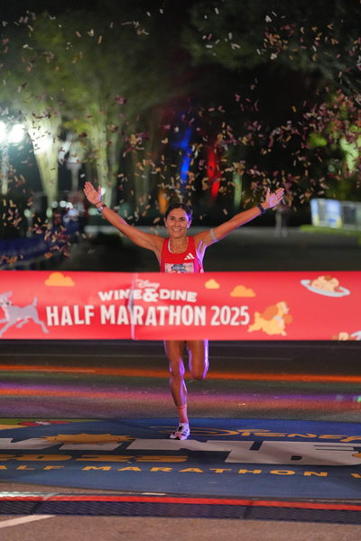 (Oct. 26, 2025) Diana Bogantes Gonzalez of San Rafael, Costa Rica, crosses the finish line in 1:19:25 to win the women’s division of the Disney Wine & Dine Half Marathon in Lake Buena Vista, Fla. She also won the weekend’s 5K and 10K races.