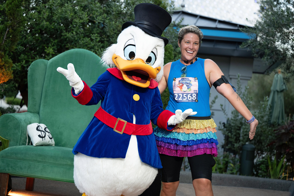 (Oct. 26, 2025) Race winners Josh Baden of Lawrence, Kan., and Diana Bogantes Gonzalez of San Rafael, Costa Rica, share a smile with Pluto after crossing the finish line at the Disney Wine & Dine Half Marathon in Lake Buena Vista, Fla. The race capped off a fun-filled weekend that included a 5K, 10K and a half marathon.