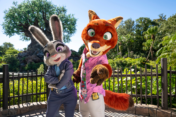 Judy Hopps and Nick Wilde debut their new looks inspired by the Walt Disney Studios film "Zootopia 2." Guests will be able to meet them at the Zoogether Day Gathering Spot at Disney's Animal Kingdom Theme Park at Walt Disney World Resort in Florida. (Amy Smith, photographer)